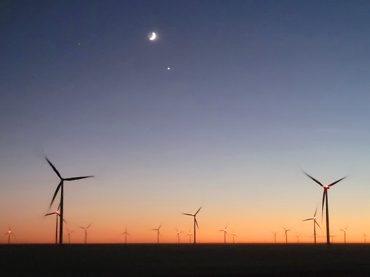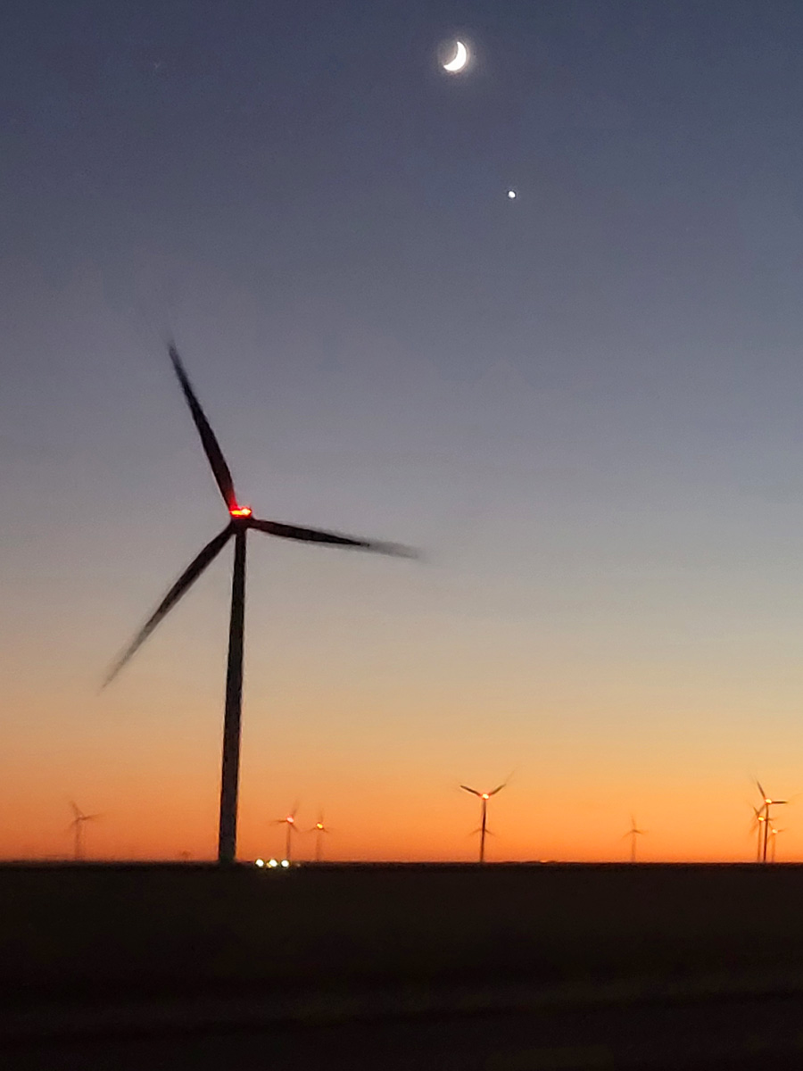 그래서 2차선으로 얌전히 달렸기 때문에, 조수석의 아내가 창밖으로 풍력발전기들 위로 뜬 그믐달 사진을 찍을 수 있었다.