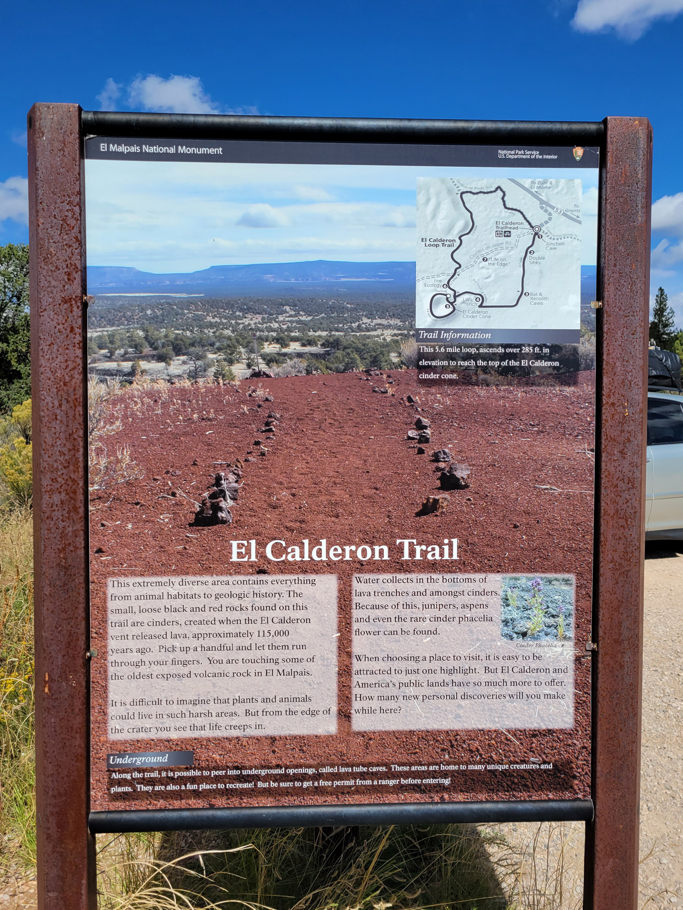 트레일 안내판 위에 적혀진 이 곳의 이름은 엘말파이스 내셔널모뉴먼트(El Malpais National Monument)로 뉴멕시코 주에 있는 13개의 준국립공원들 중 하나이다. 원래 이리로 오는 길에 있는 국립공원청의 Information Center에 먼저 들리려고 했지만, 문을 열지 않아서 바로 트레일헤드를 찾아왔다. (구글맵으로 위치를 보시려면 클릭)