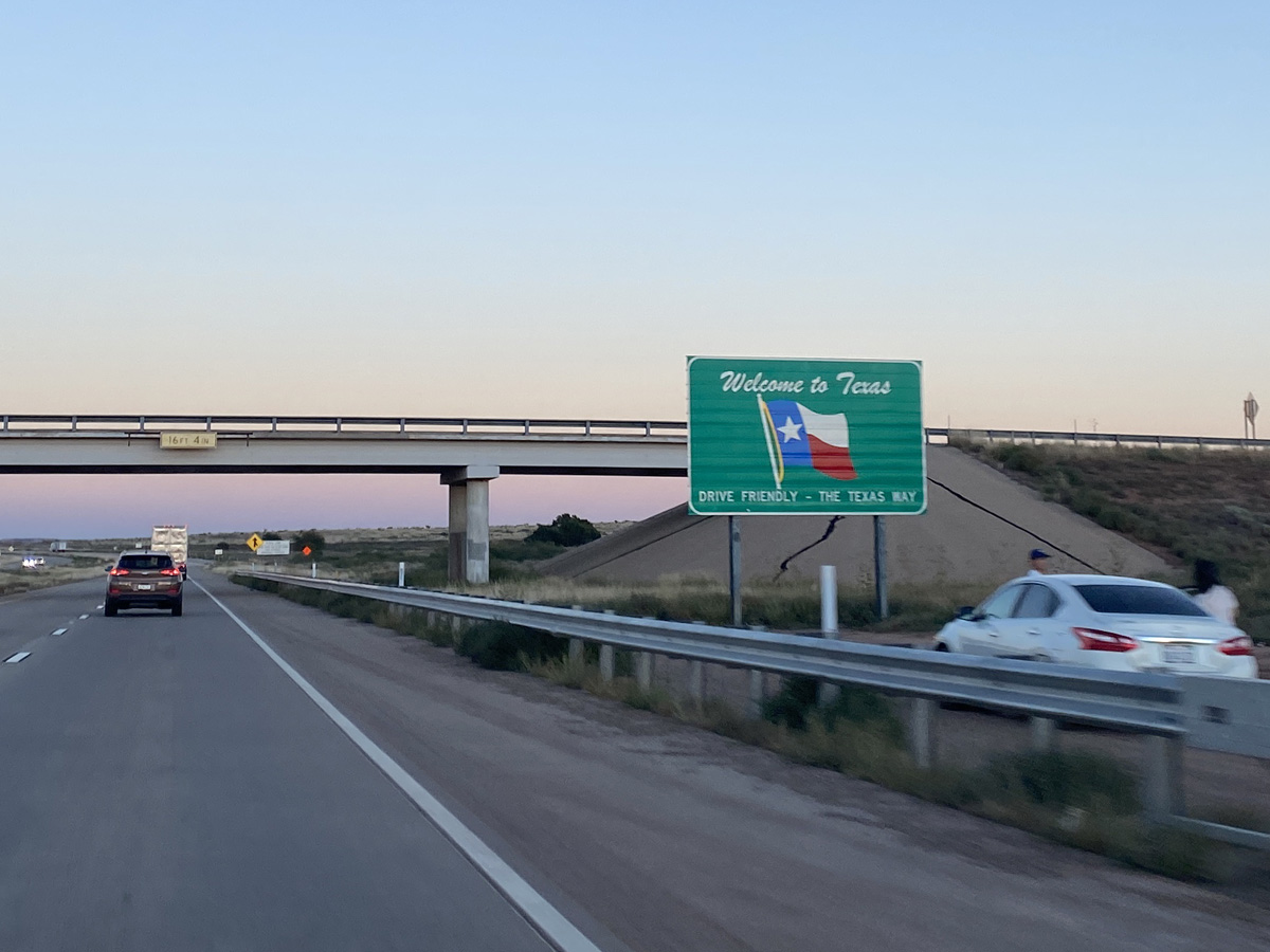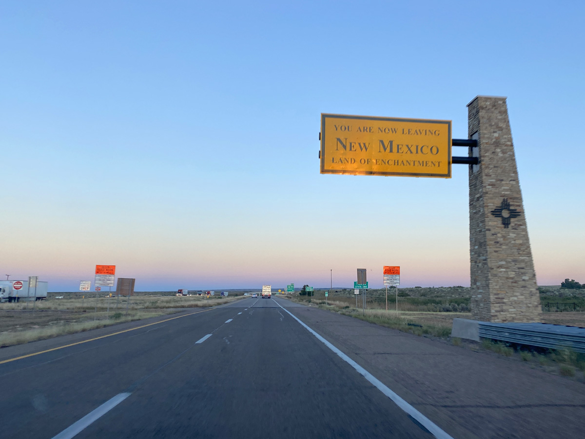 보라색 황혼과 함께 "매혹의 땅(Land of Enchantment)"을 떠나고 있는 모습이다. 고속도로 반대쪽의 뉴멕시코로 들어가는 방향은 저 기둥 두 개를 세워서 아예 환영게이트를 만들어 놓았는데, 이번에 대륙횡단을 하면서 지나간 17개의 주들 중에서 뉴멕시코가 주경계의 간판을 가장 거창하게 만들어 놓은 주였다.