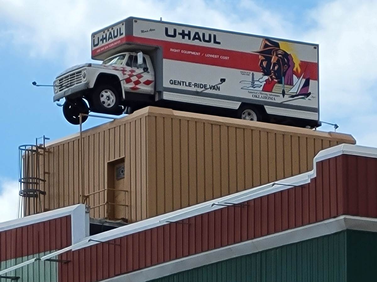 주차장 옆 건물 꼭대기에 유홀(U-Haul) 이사트럭이 놓여있는게 재미있어서 사진을 찍고 있는데, 우리 차의 캘리포니아 번호판을 보고 여행객이라 생각했는지, 지나가던 사람이 토네이도가 불어서 트럭이 저기까지 날려서 올라갔다고 친절히 설명을 해주었다.^^
