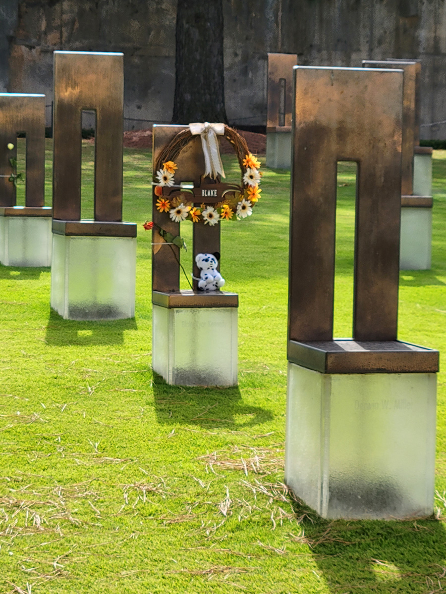 그 잔디밭에는 사망자 168명을 상징하는 168개의 빈 의자가 놓여있어서 'Field of Empty Chairs'라고 부른다. 의자는 9줄로 배열되어 있는데 1층부터 9층까지 각 층에서 희생된 사람들의 이름이 각각 새겨져 있다고 한다.
