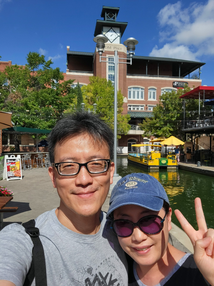 운하를 따라서 쇼핑몰이 있는 곳까지 걸어와서, 빠질 수 없는 커플셀카 한 장 또 찍었다. 오클라호마(Oklahoma)는 1830년대에 남동부에서 여기로 강제 이주된 다섯 부족 중의 하나인 촉토(Choctaw) 원주민의 언어로 '붉은 사람들' 즉 백인이 아닌 모든 인디언들을 뜻하는 말이라고 한다.
