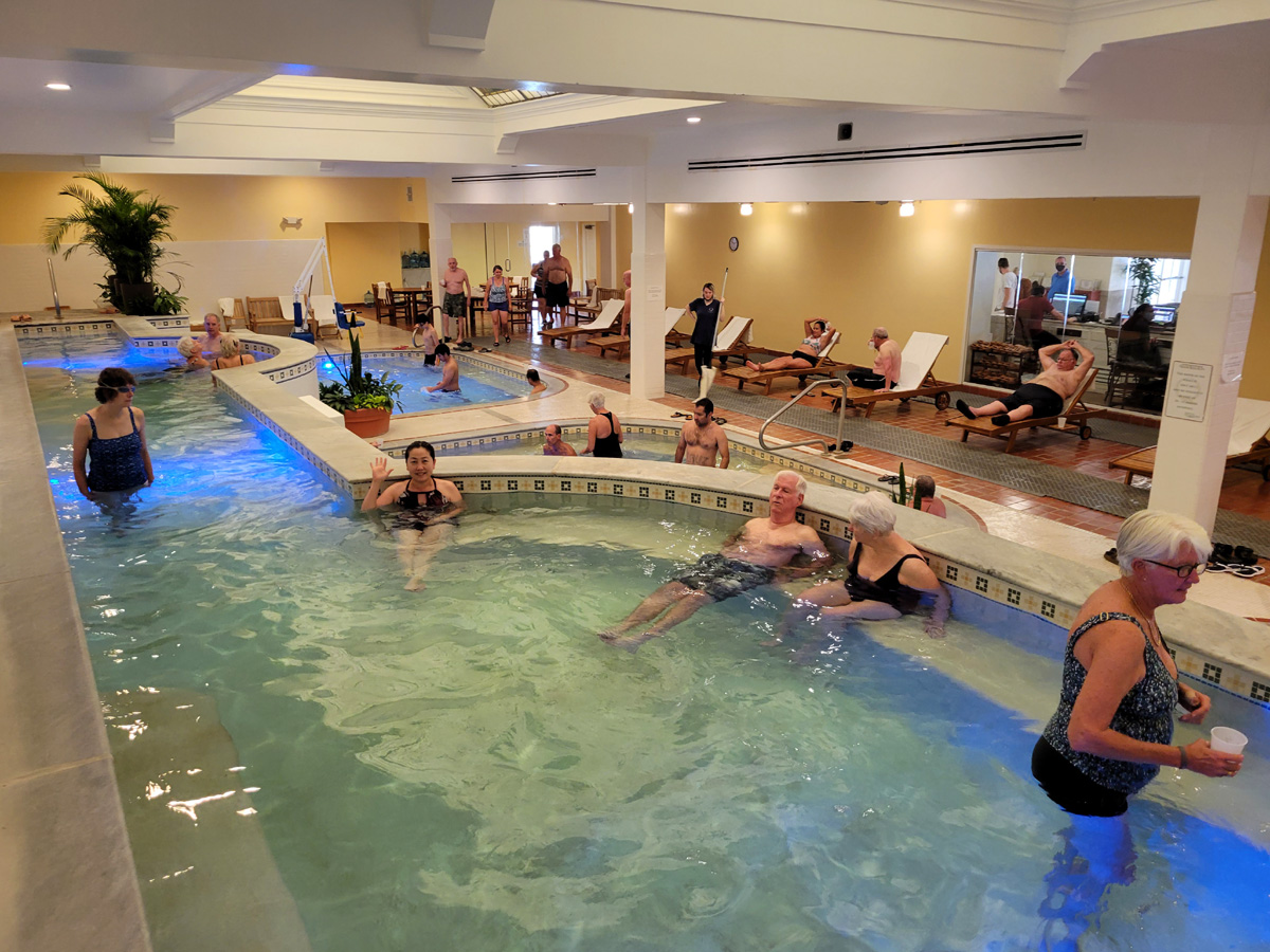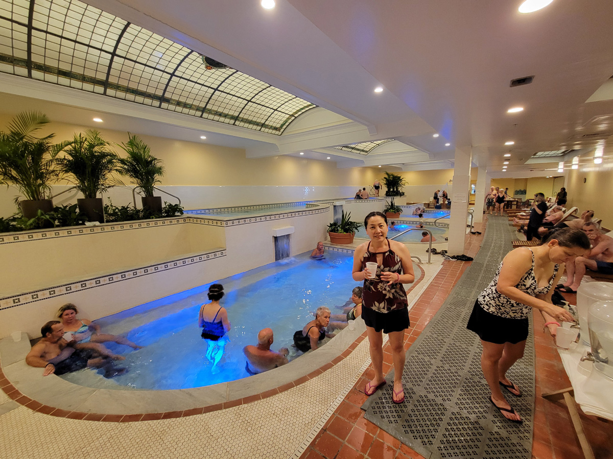 미리 이삿짐에서 빼서 따로 챙겨놓고 준비해 간 수영복과 샌달을 신고 시원한 물 한 잔 들고 있는 아내의 모습이다. 탈의실에서 잠깐 핸폰을 들고 나와서 이렇게 내부 사진을 찍는 것도 가능했고, 직원이 물에 들어가 있는 모습을 찍어주기도 했다. 무엇보다 코로나로 온천탕에 한 번에 입장하는 이용객 수를 제한을 했기 때문에, 일단 들어가서는 아주 널널한 환경에서 원하는 만큼 온천을 즐길 수가 있어서 좋았다.