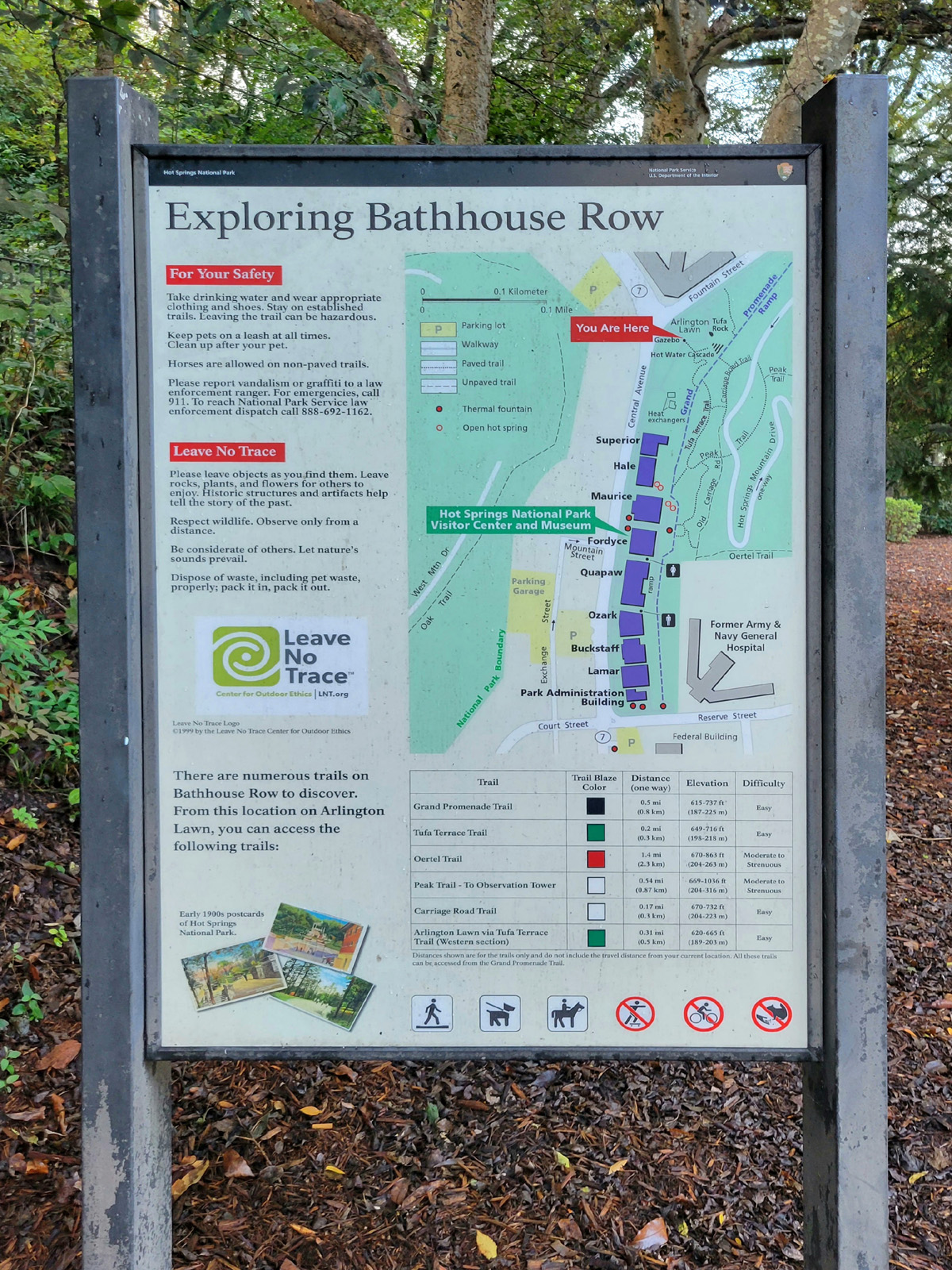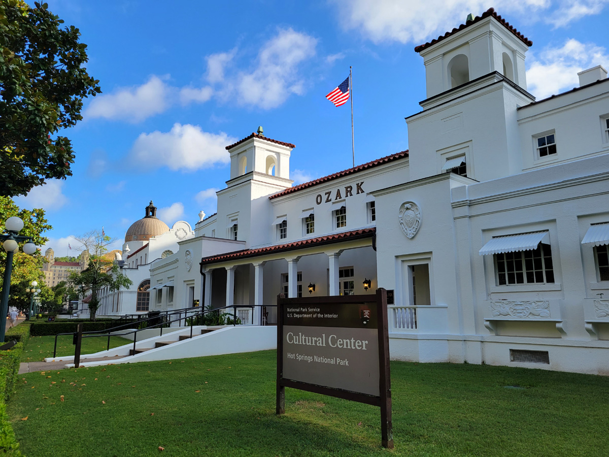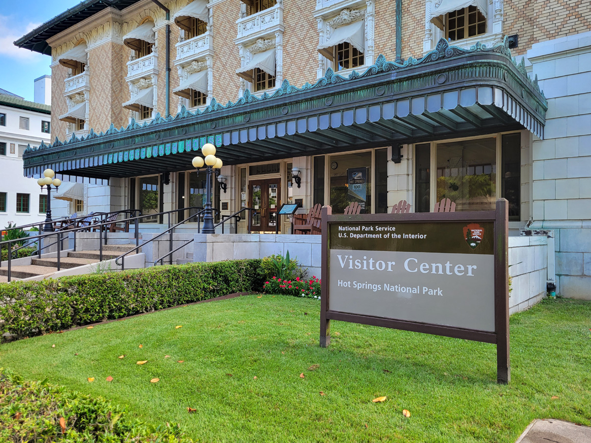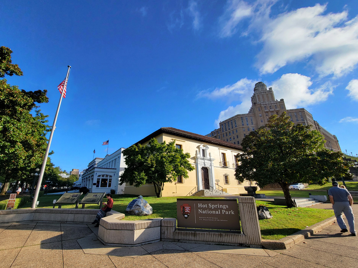 국립공원 간판이 보이는 제일 남쪽까지 내려왔는데, 가운데 보이는 노란 2층 건물은 1936년에 국립공원 관리소로 지어진 것으로 온천은 아니다. 오른쪽 언덕 위에 거대하게 우뚝 서있는 건물은 1933년에 당시 전쟁부(War Department)에서 온천수를 이용한 부상병들의 치료와 휴양의 목적으로 건설한 육군/해군 종합병원(Army & Navy General Hospital)이었다. 지금은 아칸소 주정부 소유의 건물로 국립공원 밖이지만, 별도로 국가유적지(National Register of Historic Places)로 지정이 되어있다고 한다.
