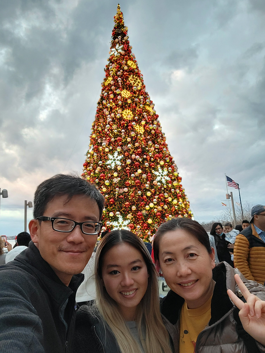 역시 떠나온 LA 그로브몰이 생각나게 만들었던, 커다란 원뿔형의 트리 앞에서 가족사진 셀카를 한 장 찍었다. 위기주부의 얼굴이 나온 김에... "블로그 방문하신 모든 분들, 2022년 새해 복 많이 받으세요~"