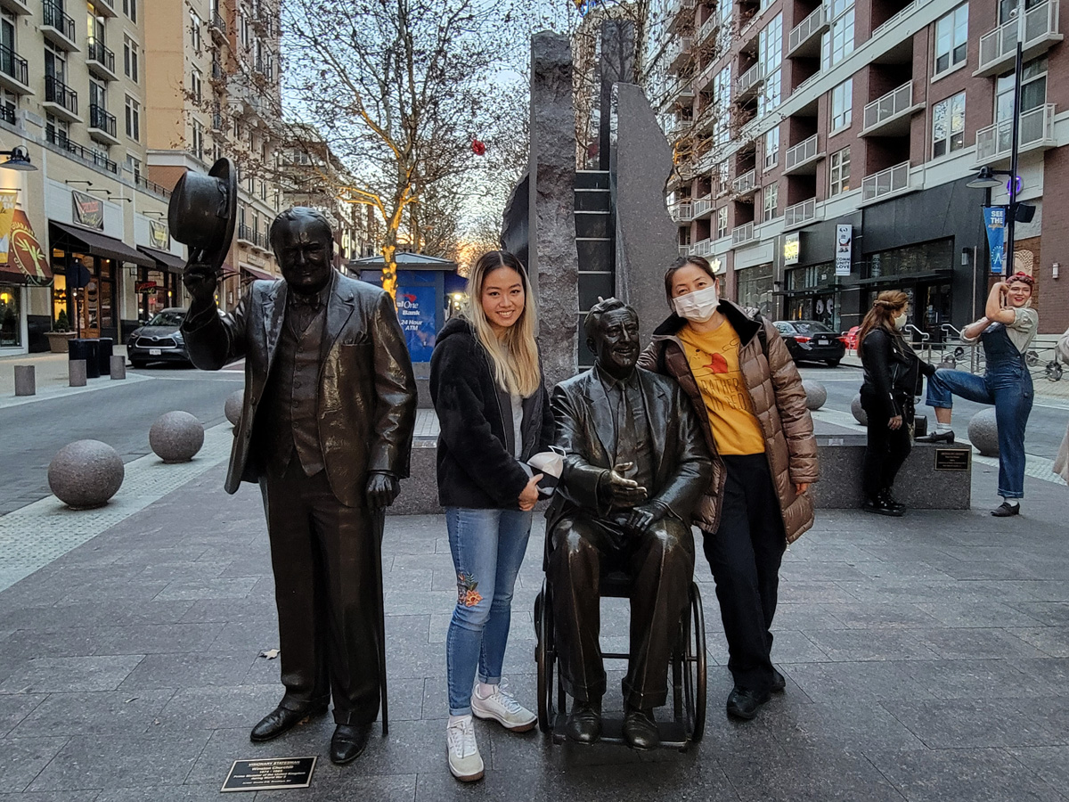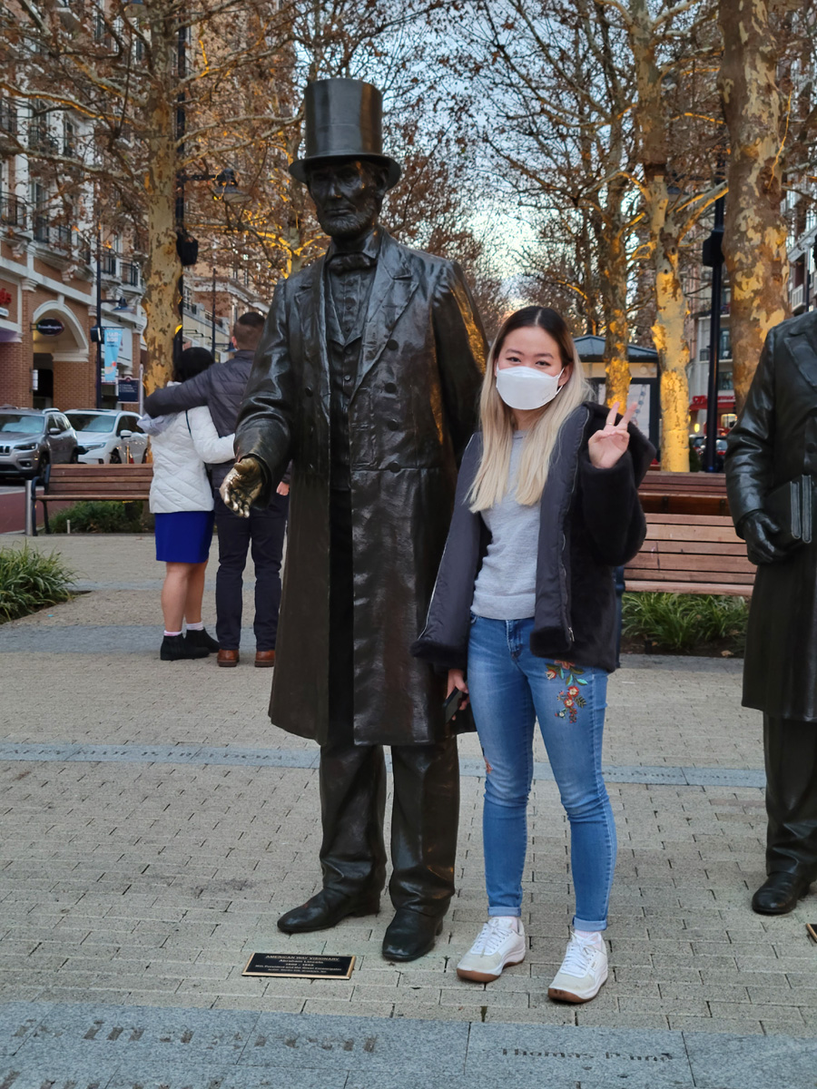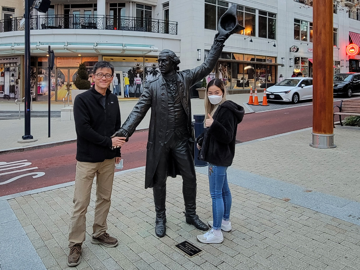 코로나로 함부로 여기저기 만질 수는 없지만, 그래도 워싱턴과 악수를 안 할 수 없었다...^^ 동상을 기단도 전혀 없이 잘 세워놓아서, 정말로 보도블럭 위에 서있는 워싱턴과 마주하고 있는 느낌이 들도록 한 것이 참신했다.