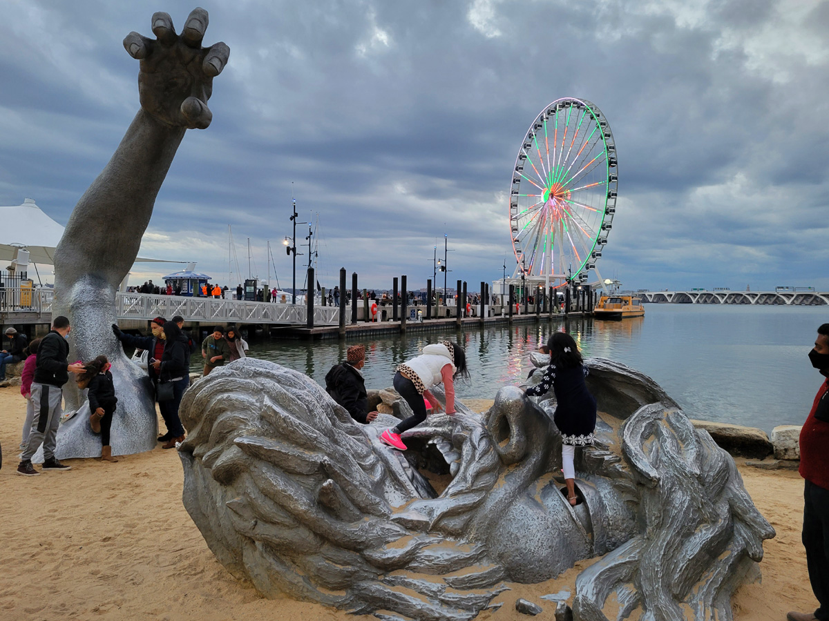 부두로 나가기 전에 강가에 또 유명한 조각작품이 하나 있다고 해서 모래사장으로 내려가 봤는데, 여기서는 어떤 작품인지 한 번에 잘 보이지가 않는다...