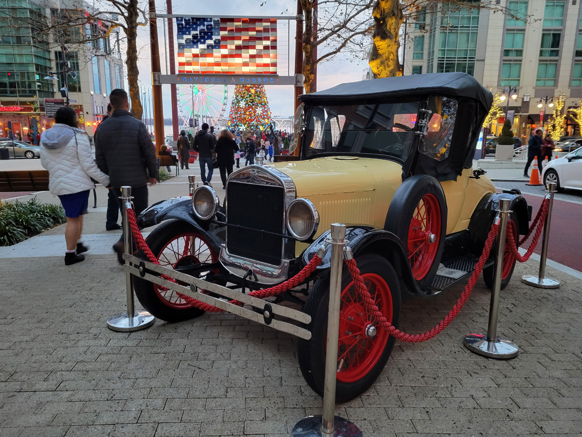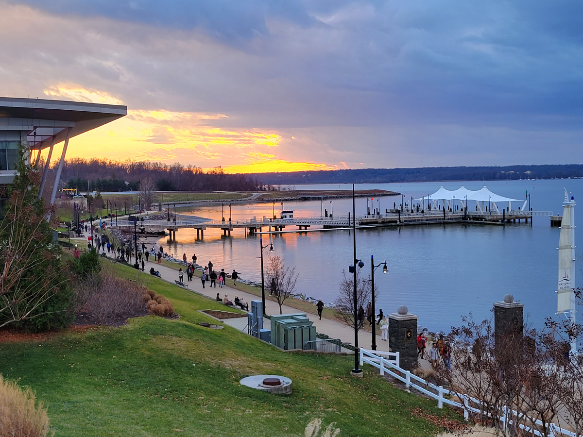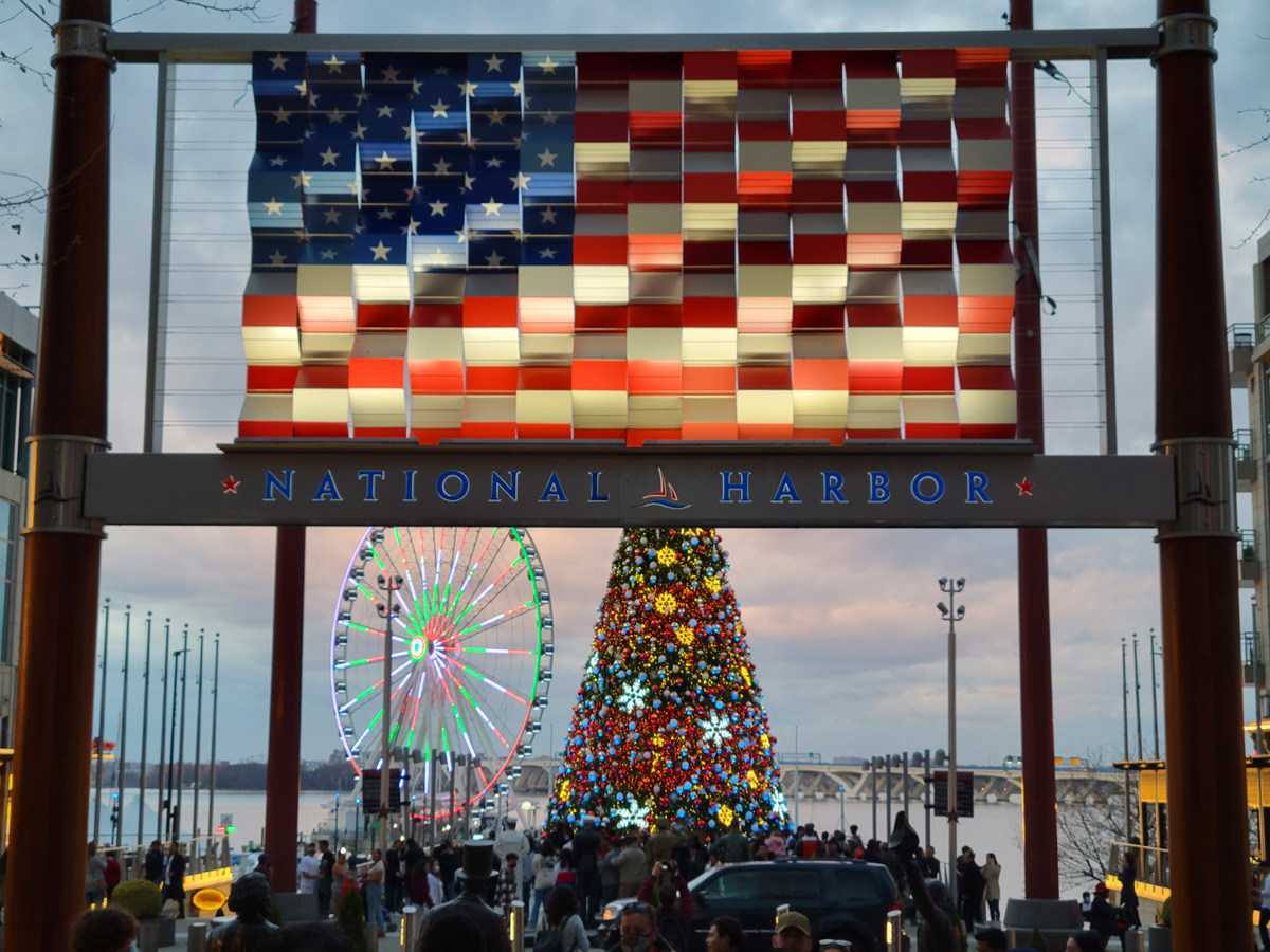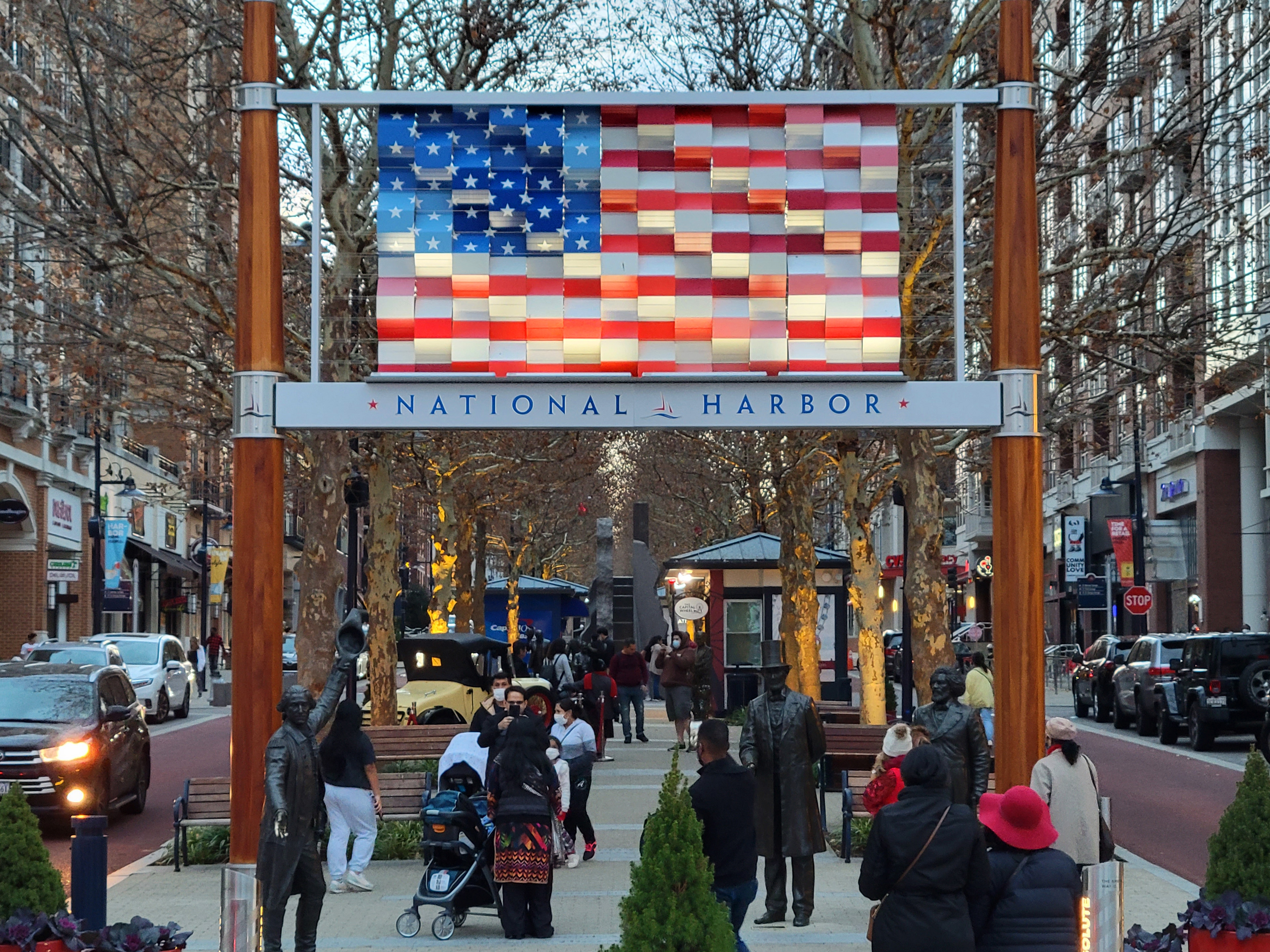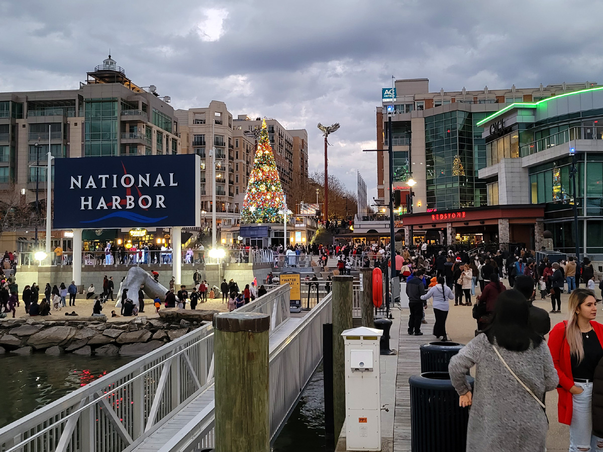 관람차가 있는 부두로 연결되는 중심가로 걸어가는데 가로수에 연말 크리스마스 장식을 해놓았다. 처음에는 이 곳의 위치와 분위기를 보고 LA의 산타모니카 바닷가가 떠올랐지만, 내셔널하버는 계획적으로 리조트와 컨벤션센터로 개발된 곳이라는 큰 차이가 있다. 특히 멀리 정면에 유리로 만든 고층건물이 보이는데 2016년에 문을 연 MGM National Harbor 카지노호텔로, 메릴랜드는 미국에서 일반 카지노가 합법인 18개 주들 중의 하나이다.