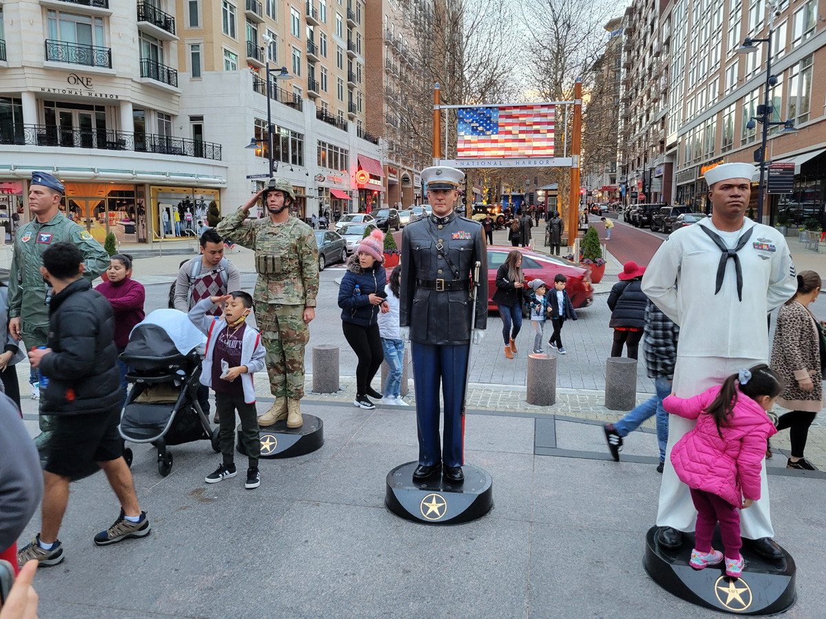 원래 국가적인 역사나 의미가 있는 장소가 아니라서, 의도적으로 '내셔널'이라는 이름에 걸맞게 국가적(또는 애국적?)인 동상과 조형물들을 많이 세워놓는 노력을 했다. 중심가의 아메리칸웨이 야외공원(American Way Outdoor Park) 입구에 해군, 해병대, 육군, 공군, 그리고 사진에는 안 보이지만 국경수비대까지 총 5명의 살아있는 것 같은 동상이 아주 잘 만들어져 있었다.