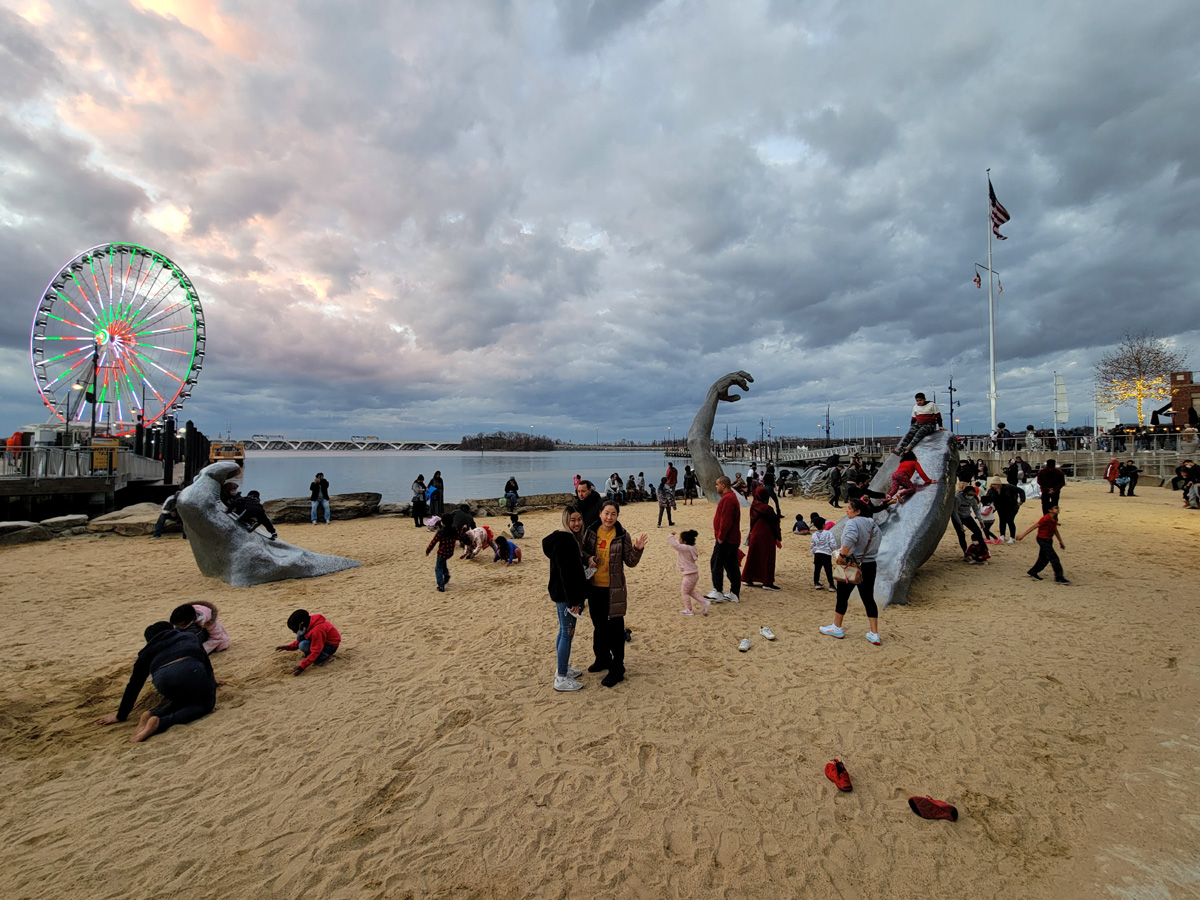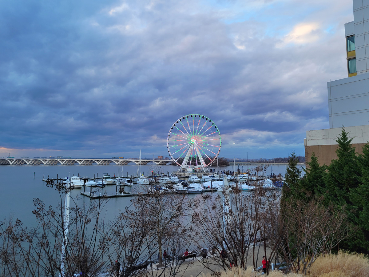 수도 워싱턴에서 '내셔널' 크리스마스 트리를 구경하고는 남쪽으로 20분 정도 달려서, 이름만으로는 컨테이너들이 가득한 미국의 '국가적 항구'로 오해하기 십상인 메릴랜드 주의 내셔널하버(National Harbor)로 왔다. 먹구름 아래로 비추는 해질녁의 주황 햇살이 반사되는 저 수면은 바다가 아닌 포토맥 강(Potomac River)이고, 강 건너의 육지는 버지니아(Virginia)로, 처음에 내셔널하버라는 이름만 듣고는 LA의 롱비치같은 컨테이너 항구를 생각했다가 완전히 한 방 먹었다~