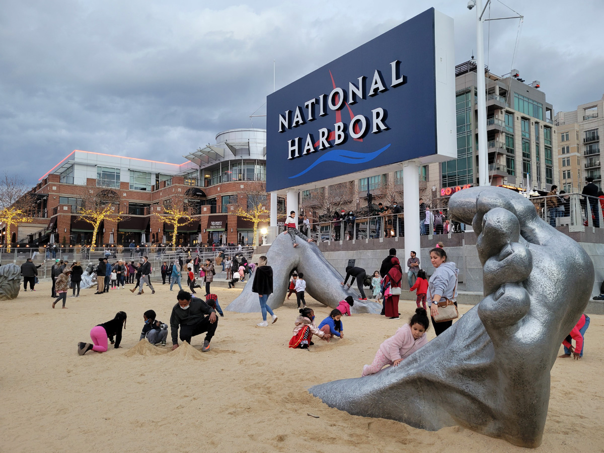 왠지 '발꾸락'으로 불러야 할 것 같은 커다란 발가락들은 땅 밖으로 끝부분만 나온 오른발이고, National Harbor 간판 아래쪽에는 꼬마가 올라가 있는 세워진 왼쪽 무릎이 보인다.