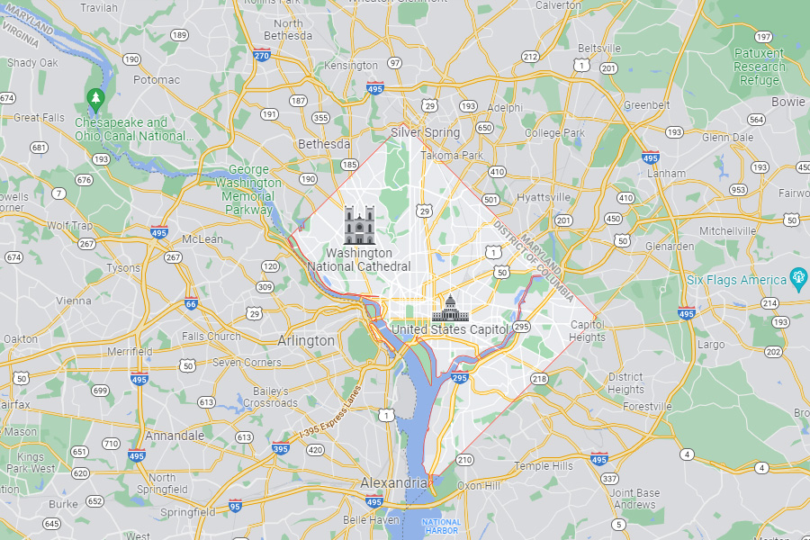 물론 요트가 몇 척 떠있으니 항구(harbor)가 맞기는 하지만, 그 이름도 거창하게 '내셔널' 하버로 불리는 이유는... 1980년대까지 옛날 플랜테이션 농장이 남아있던 자리를 2000년대 들어서 강가의 리조트로 개발을 하면서, 이 소규모 개발지역의 공식적인 지명을 National Harbor로 새로 만들었기 때문이다. 대형 관람차 뒤쪽으로 포토맥 강을 건너는 큰 다리가 보이는데, 인터스테이트 95번 겸 495번 고속도로가 지나가는 Woodrow Wilson Memorial Bridge로 버지니아 출신의 제28대 대통령 우드로 윌슨의 이름을 딴 것이다. 이 쯤에서 이해를 돕기 위해서 아래의 지도를 한 장 보여드려야 할 것 같다.