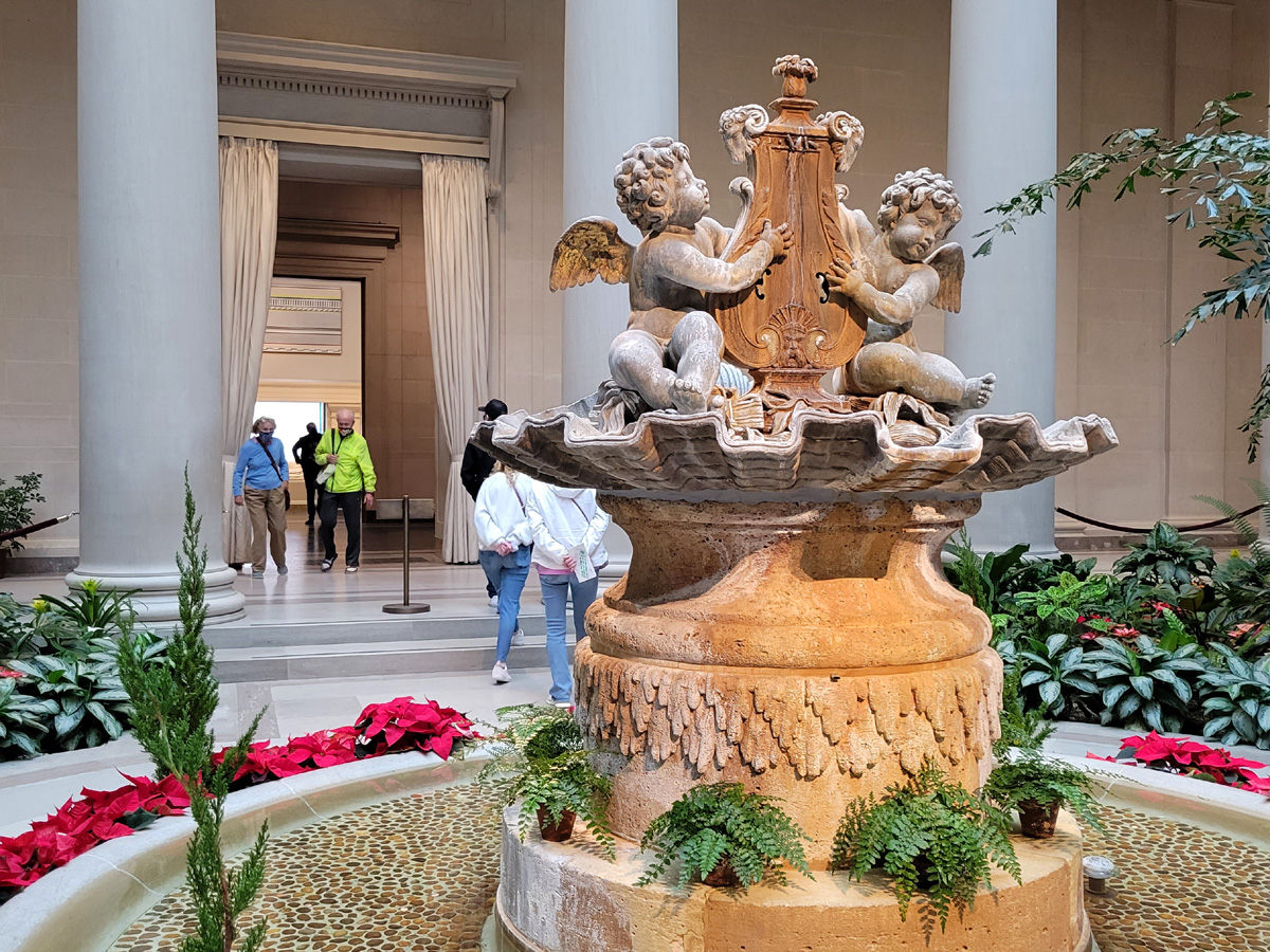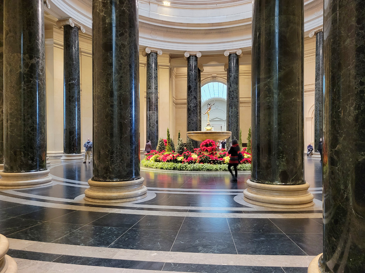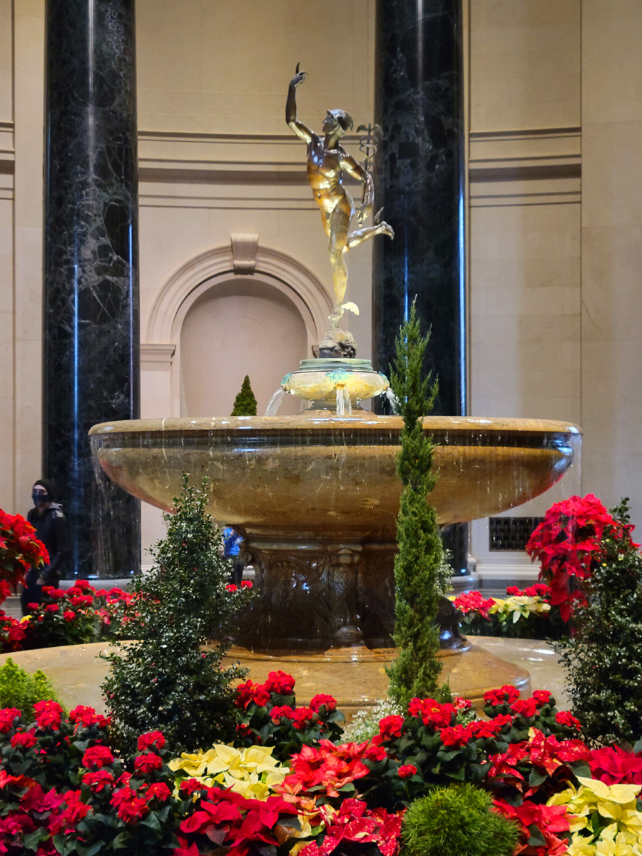 주층으로 올라와서 중앙 로툰다(Rotunda)의 까만색 대리석 기둥들과 그 중앙의 머큐리(Mercury) 동상이 서있는 분수를 보니까, 옛날 여기에 와봤던 기억이 푸드득 떠올랐다. 분수 주변은 연말연시를 맞아 포인세티아를 심어 놓아서 달라보이는 것은 당연한데, 10년전 사진을 보면 동상이 까맣고 미술관 소개에도 청동(bronze)으로 만들었다고 되어 있지만, 지금은 황금색으로 보이는 것은 왜일까?