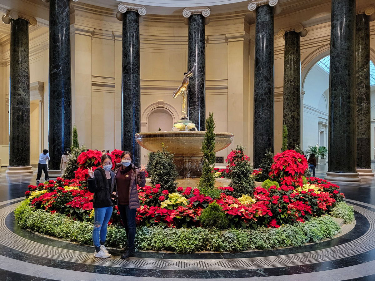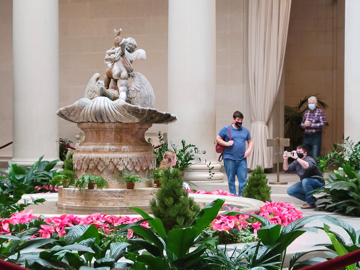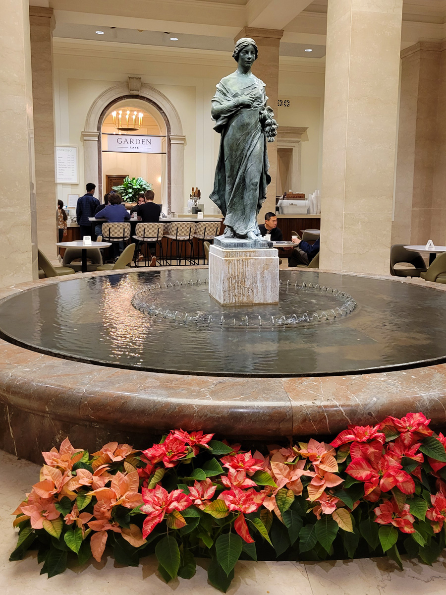 주층으로 올라와서 중앙 로툰다(Rotunda)의 까만색 대리석 기둥들과 그 중앙의 머큐리(Mercury) 동상이 서있는 분수를 보니까, 옛날 여기에 와봤던 기억이 푸드득 떠올랐다. 분수 주변은 연말연시를 맞아 포인세티아를 심어 놓아서 달라보이는 것은 당연한데, 10년전 사진을 보면 동상이 까맣고 미술관 소개에도 청동(bronze)으로 만들었다고 되어 있지만, 지금은 황금색으로 보이는 것은 왜일까?