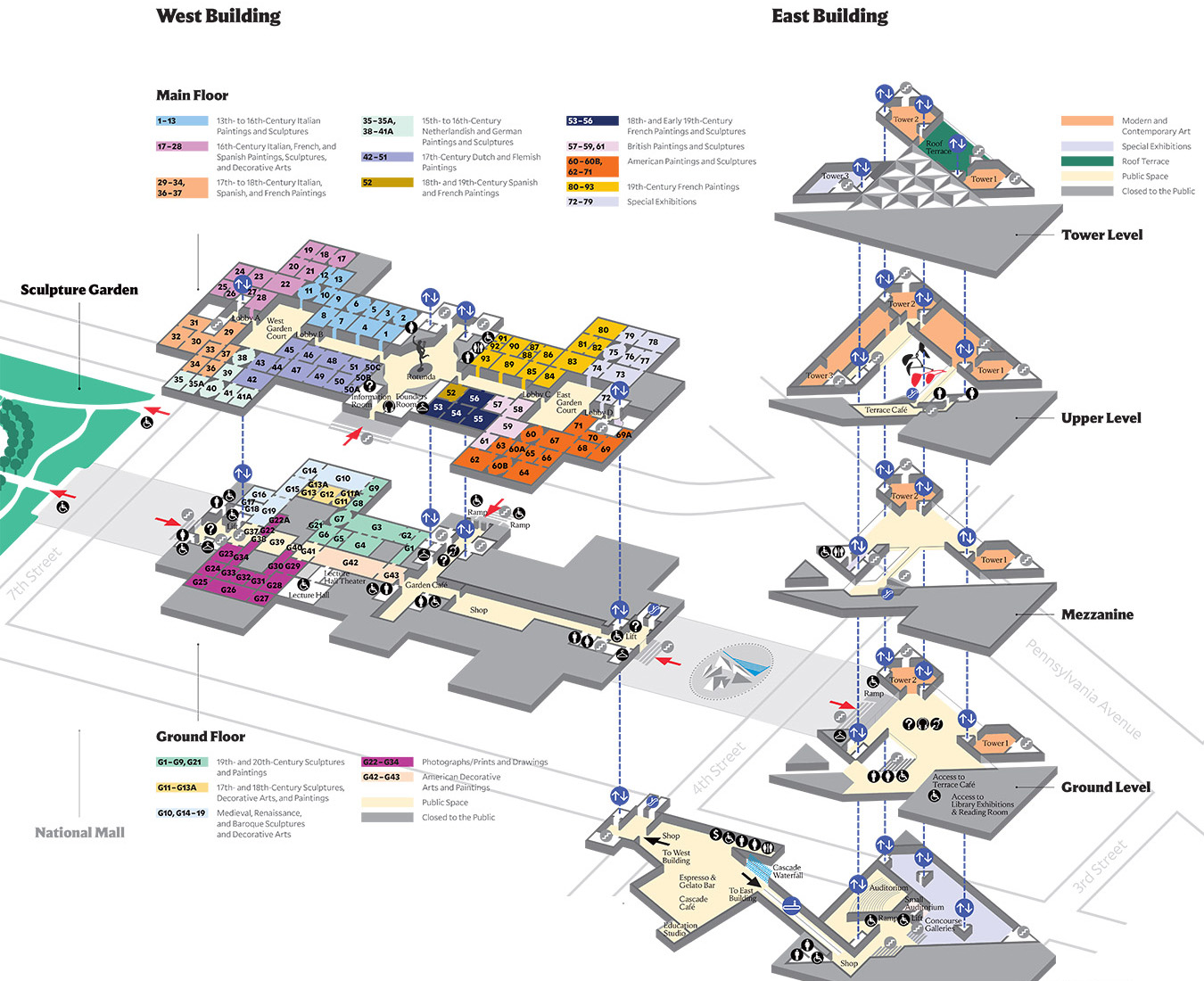 이 복잡한 지도가 한 번에 이해되지 않아도 걱정하지 마시기를... 이 날 우리는 왼쪽 서관의 Main Floor와 오른쪽의 동관을 둘 다 구경했는데, 이 포스팅에서는 서관만 소개한다. 전시된 현대미술 작품들처럼 건물도 이해하기 어렵게 만들어진 동관은 추후 별도의 포스팅으로 소개할 예정이다. 그런데 조각작품들이 주로 있는 서관 Ground Floor의 전시실들은 들어가 보지도 못했기 때문에 완전한 격파(?)를 위해서는 다시 또 방문해야 한다.
