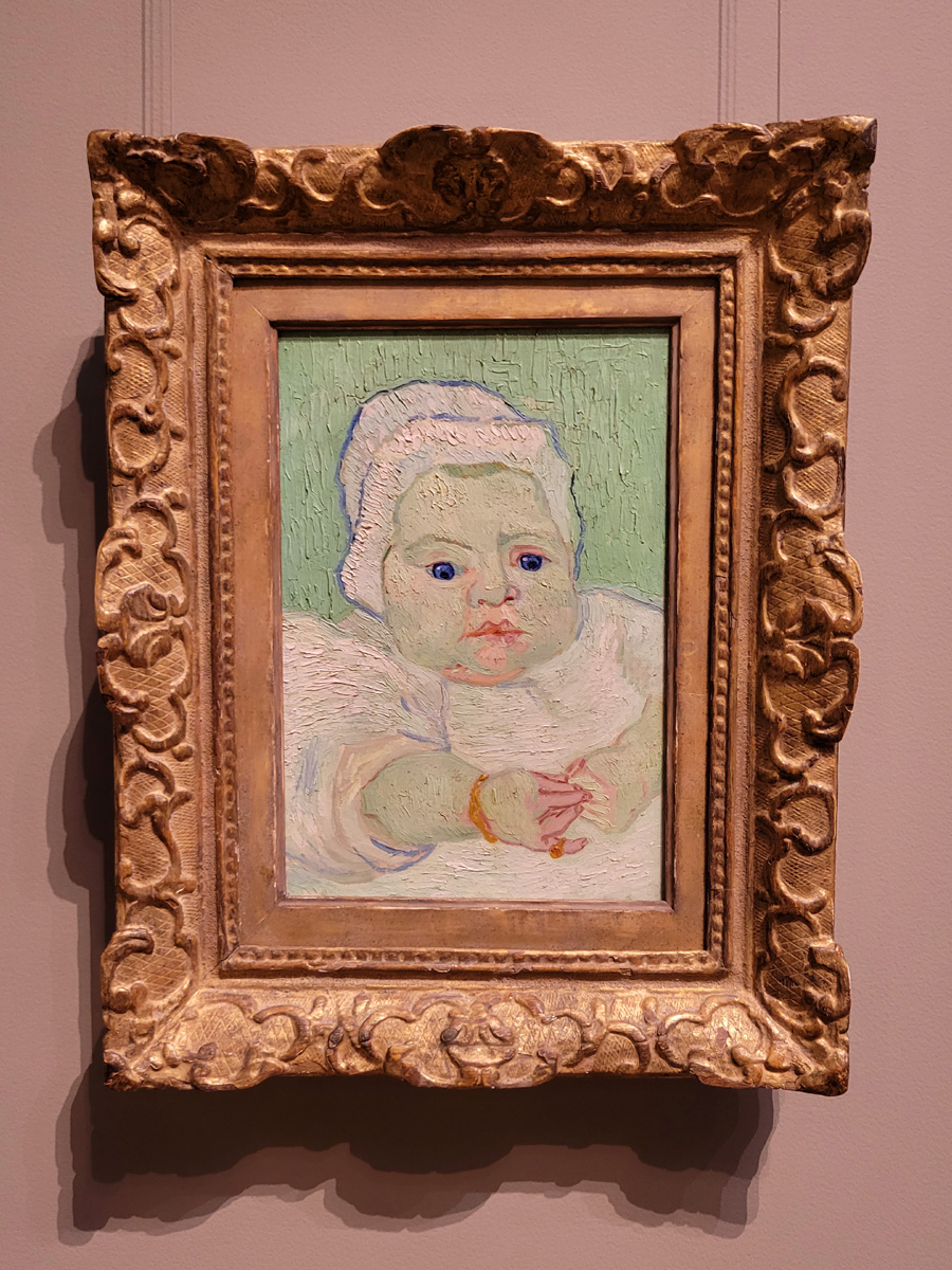 유일하게 그림만 꽉 차게 찍은 사진으로 소개하는 Roulin's Baby 그림이 오늘의 주인공이다.^^ 고흐의 이웃이자 모델로 자주 등장한 우체부 Joseph Roulin의 아기라고 하는데, 통통한 아기가 귀엽기도 하고 왜 피부색이 슈렉처럼 녹색일까 궁금해서 한 참을 쳐다봤다. (포스팅을 쓰면서 찾아보니 암스테르담의 반고흐 미술관에 피부가 살색으로 그려진 똑같은 작품이 또 있는 것으로 봐서, 아마도 이 작품은 붉은 물감이 부족해서 그리다가 포기한 미완성의 작품이 아닐까?)