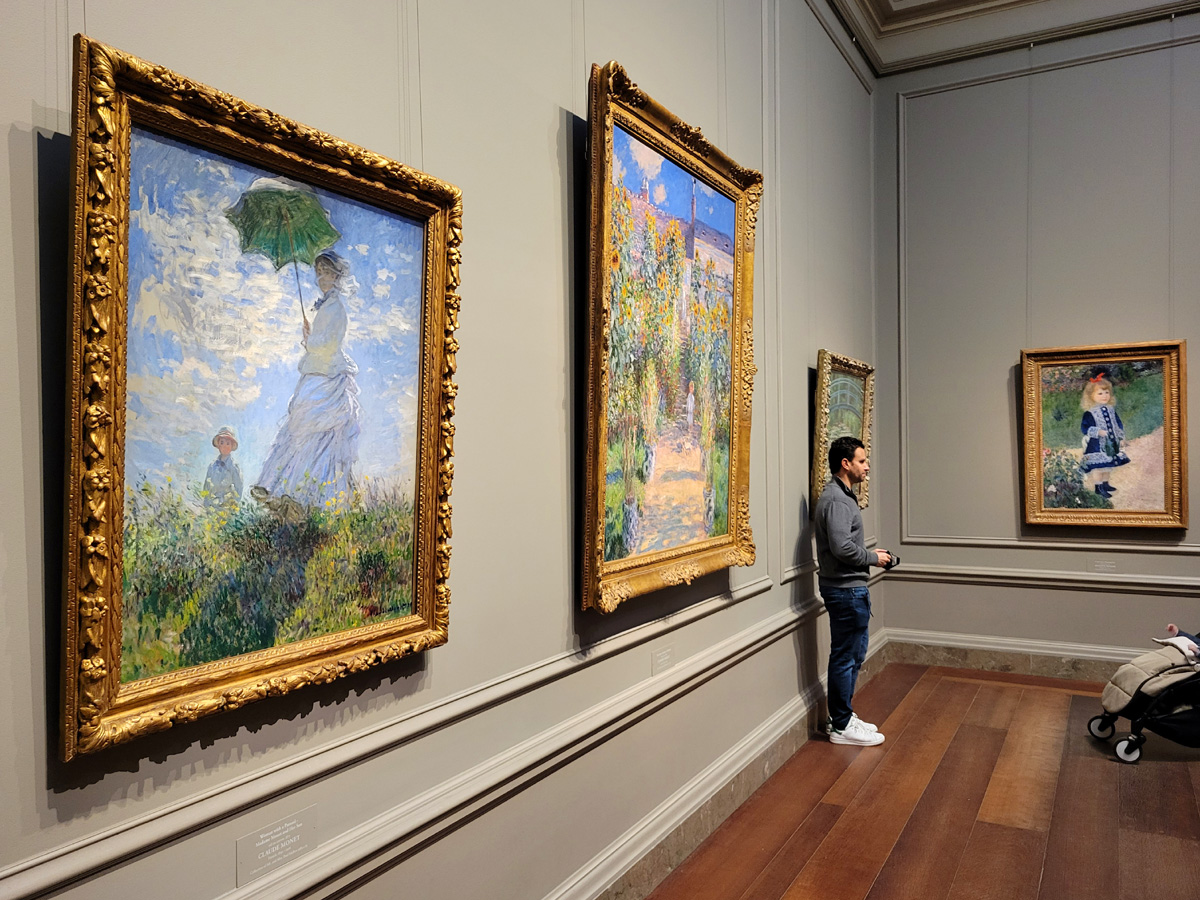 85번 전시실의 클로드 모네(Claude Monet)... 왼쪽의 Woman with a Parasol - Madame Monet and Her Son 그림을 포함해 사진의 4점이 모두 모네의 작품인데, 연꽃이 등장하는 The Japanese Footbridge 그림은 남자가 바짝 붙어서 사진을 찍고 있어서 잘 보이지 않는다.