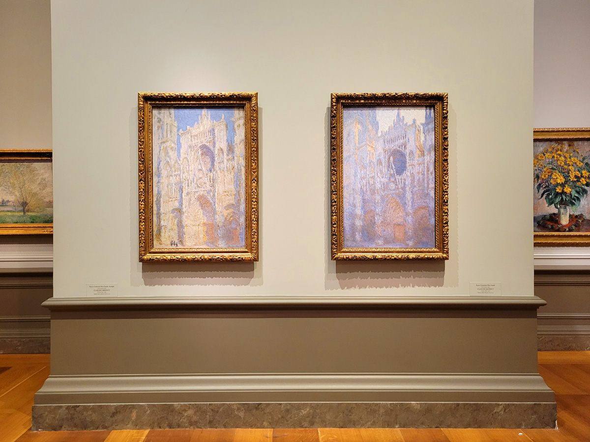 미국 국립미술관 서관 관람의 마지막 작품으로 소개하는 것은 모네가 시시각각 변하는 빛과 색깔을 표현하기 위해 30점이나 같은 위치에서 그렸다는 루앙 대성당의 모습이다. 왼쪽이 햇살이 비추는 Rouen Cathedral, West Façade, Sunlight, 오른쪽 Rouen Cathedral, West Façade 그림은 설명은 없지만 아마도 햇살이 건물 위쪽을 막 비추는 이른 아침의 순간이 아닐까 생각된다.