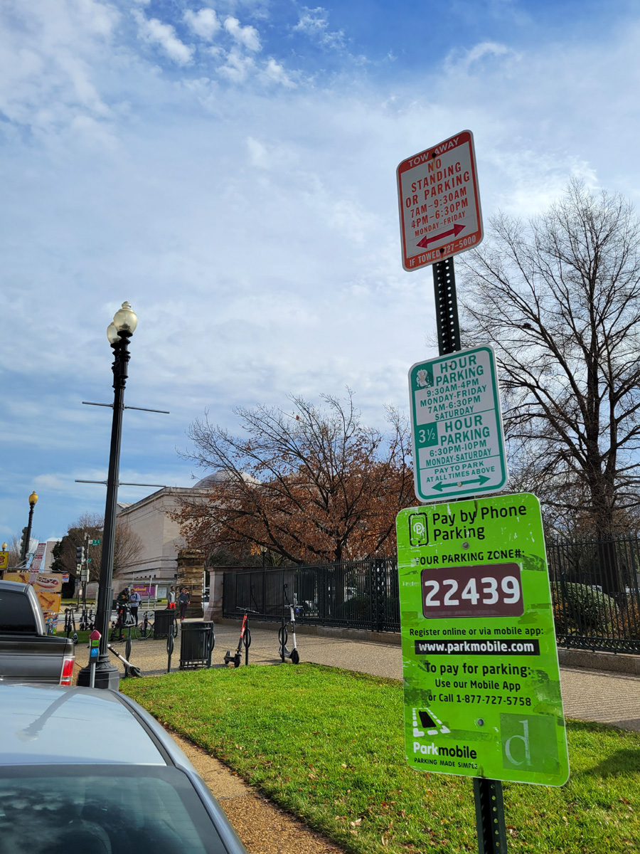 자동차를 가지고 워싱턴DC의 내셔널몰을 방문하면 거의 길가의 빈자리를 찾아서 주차를 해야한다. 안내판을 간단히 설명하면 일단 월~금요일의 출퇴근 시간에는 주차가 안되고, 그 외 주중 낮시간과 토요일에는 (글자가 지워졌는데) 2시간까지, 월~토요일 저녁시간에는 3시간반까지 유료주차가 가능한데, 제일 아래 연두색 판에 안내된 것과 같이 모바일앱으로 주차비 결제를 해야한다. 그러면 오늘같은 일요일은? 빈 자리만 찾는다면 주차비도 안 내고 무한정 주차가 가능하기 때문에, 앞으로 가능한 매주 일요일은 워싱턴DC의 박물관/미술관들 하나씩 '격파'하는 날로 정하기로 했다.^^