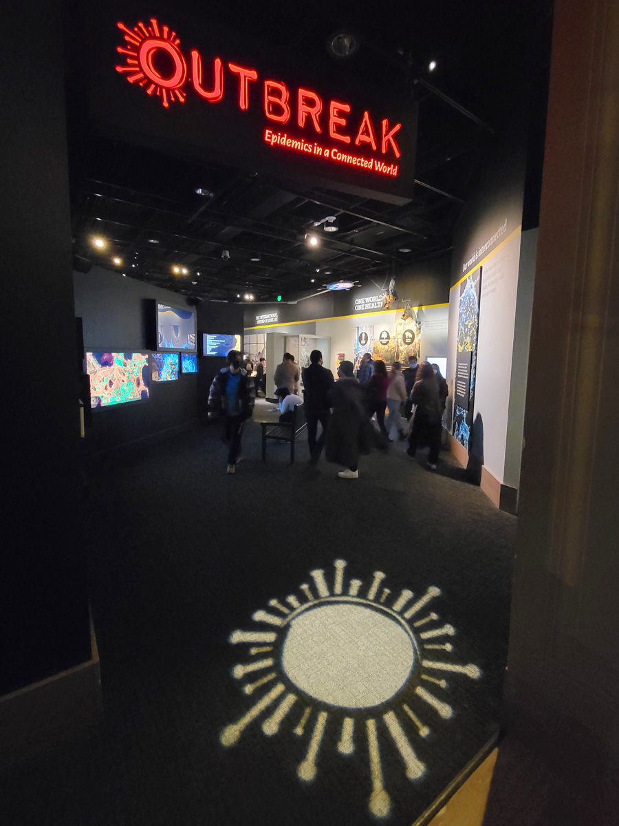 이 전시의 제목은 동명의 영화도 있는 '아웃브레이크(Outbreak)'이고, 부제는 Epidemics in a Connected World... 지난 2년간의 상황을 생각해보면 에피데믹(Epidemic)보다는 팬데믹(Pandemic)이 더 어울리지 않을까? 바닥에는 조명으로 만들어 놓은 코로나 바이러스가 꿈틀거리고 있었다.