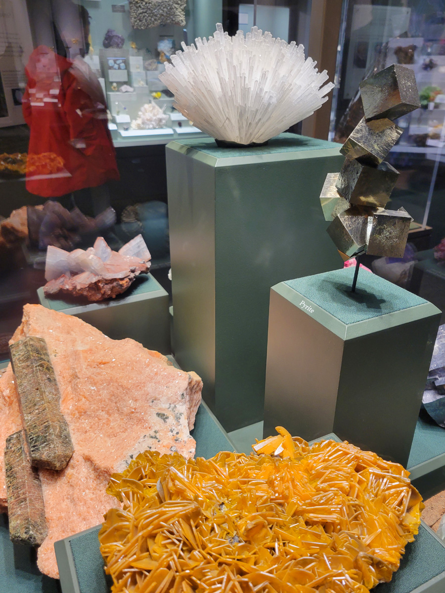 정말 신기한 색깔과 모양으로 땅속에서 저절로 만들어진 광물들이 많은데, 특히 이 사진 오른편의 파이라이트(Pyrite)는 완벽한 정육면체 결정들이 서로 연결되어서 자란 모습이다.