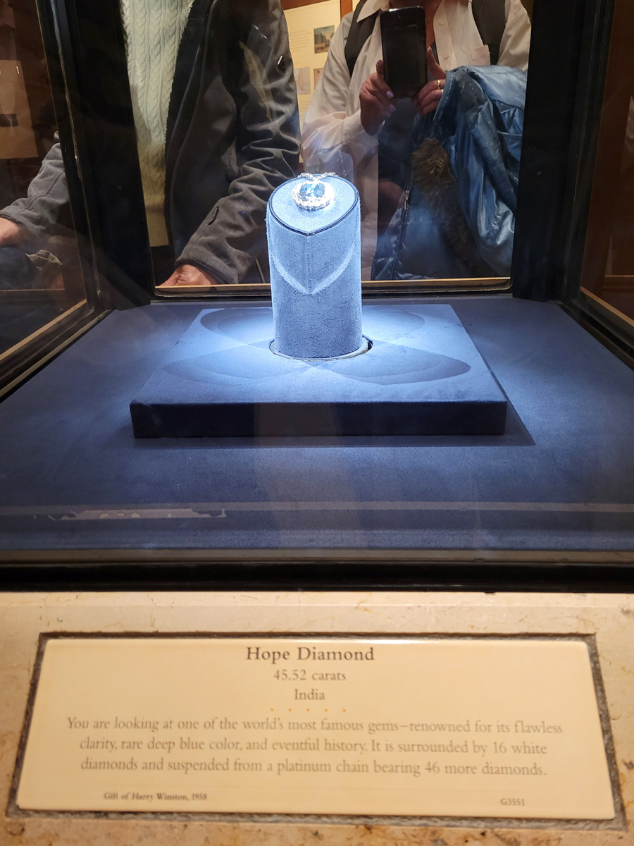 당시 줌으로 세로로 찍어서 인스타그램에 올렸던 호프 다이아몬드의 반짝이는 모습 동영상을 클릭해서 보실 수가 있다. 아무래도 궁금해 하시는 분이 계실 것 같아서 알려드리면... 위키피디아에 써있기로는 이 45.5캐럿짜리 다이아몬드는 현재 2억5천만불의 도난보험에 들어있고, 따라서 추정가는 2~3.5억불로 예상된단다.