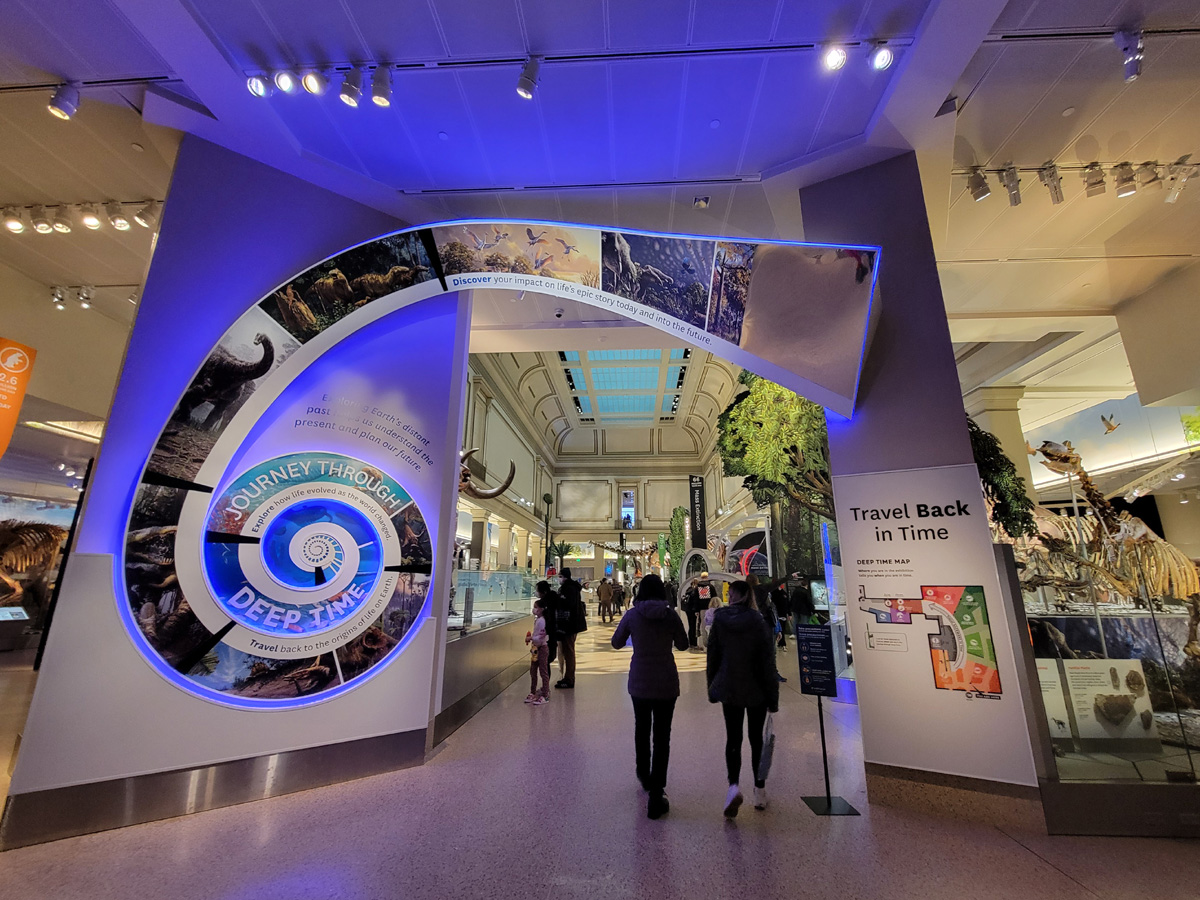 제일 먼저 오른편으로 "Journey Through Deep Time"이라 씌여진 문을 통과해서 공룡 화석을 구경하러 간다. 오른쪽에 작게 보이는 지도와 같이 공룡시대부터 시작해 시간을 거슬러 올라가면서 여러 화석들을 구경할 수 있는데, 이 곳의 전시는 2011년과는 완전히 다르게 새로 만들어진 것이었다.