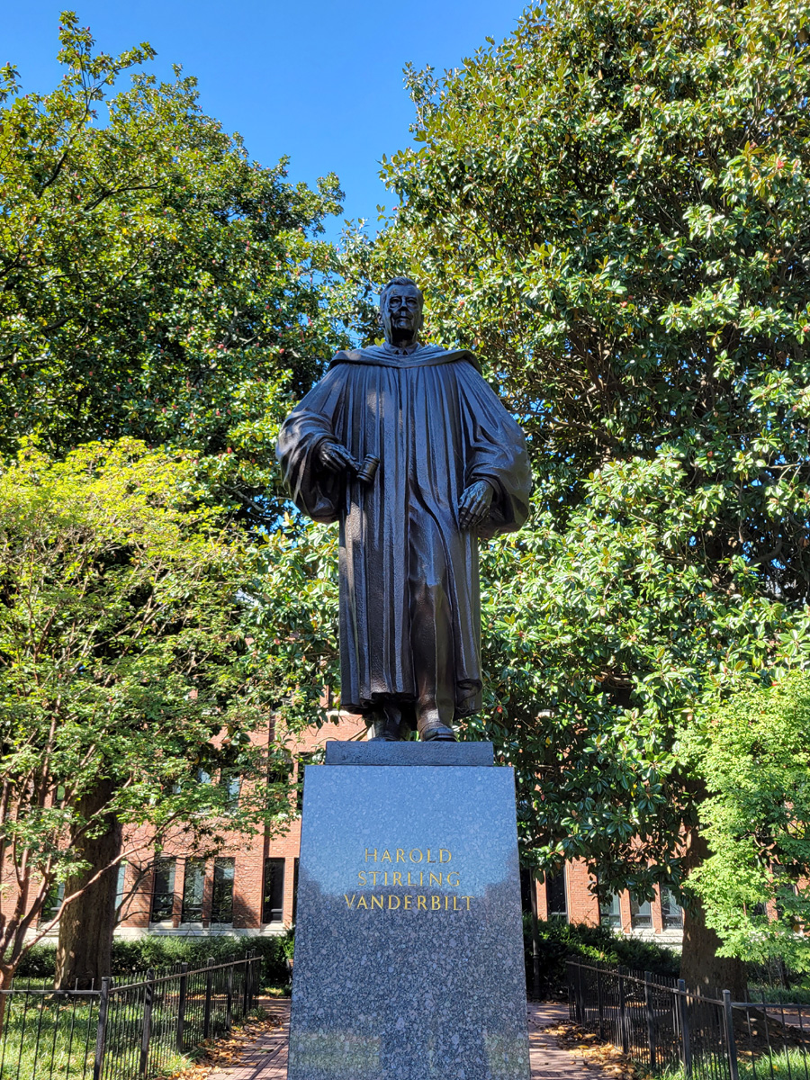 밴더빌트 대학교(Vanderbilt University)는 1873년에 처음 세워졌는데, 당시 미국의 선박왕 및 철도왕으로 최대 부호였던 Cornelius Vanderbilt가 1백만불을 기증해서 1877년에 그의 이름으로 대학명이 바뀌었다. 노스캐롤라이나 주의 듀크(Duke), 텍사스 주의 라이스(Rice)와 함께 남부를 대표하는 명문 대학이며, 전국적으로도 북동부의 아이비리그에 버금가는 최상위권의 사립대학교이다. 밴더빌트는 미국에서 가장 유명한 가문중의 하나인데, 교정을 바라보고 있는 동상은 코닐리우스의 4대손인 Harold Stirling Vanderbilt이고, CNN의 앵커로 유명한 앤더슨 쿠퍼(Anderson Cooper)의 어머니가 밴더빌트 가문의 5대손이다.
