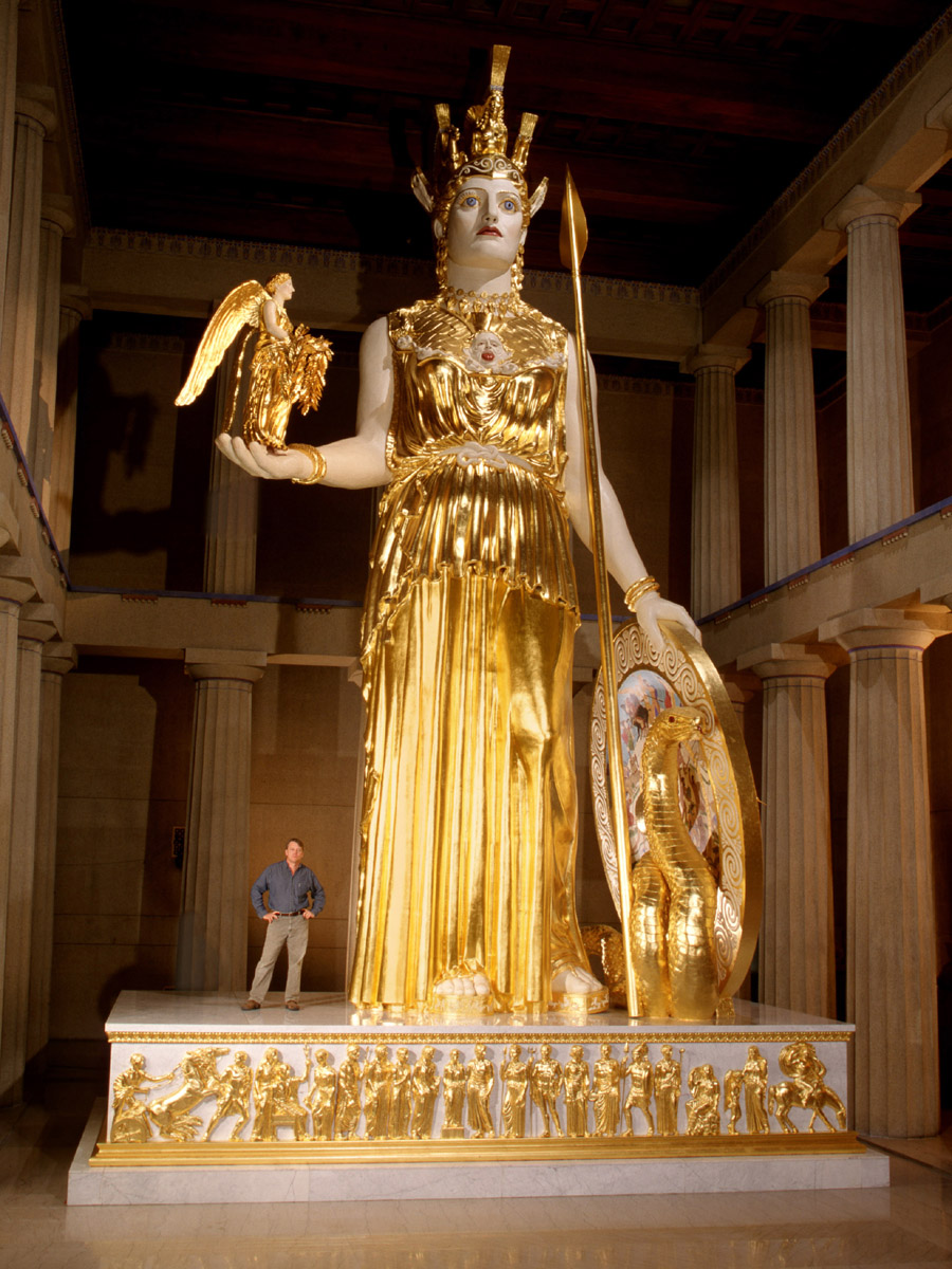 현재 이 짝퉁 파르테논 신전의 내부는 19~20세기의 미국회화를 전시하는 미술관으로 이용되고 있지만, 그림들보다도 건물 중앙에 서있는 13 m 높이의 '전쟁의 여신' 아테나(Athena)의 동상으로 유명한데, 아래 위키피디아에서 가져온 사진과 같이 3.6 kg의 금박이 입혀져 있단다.