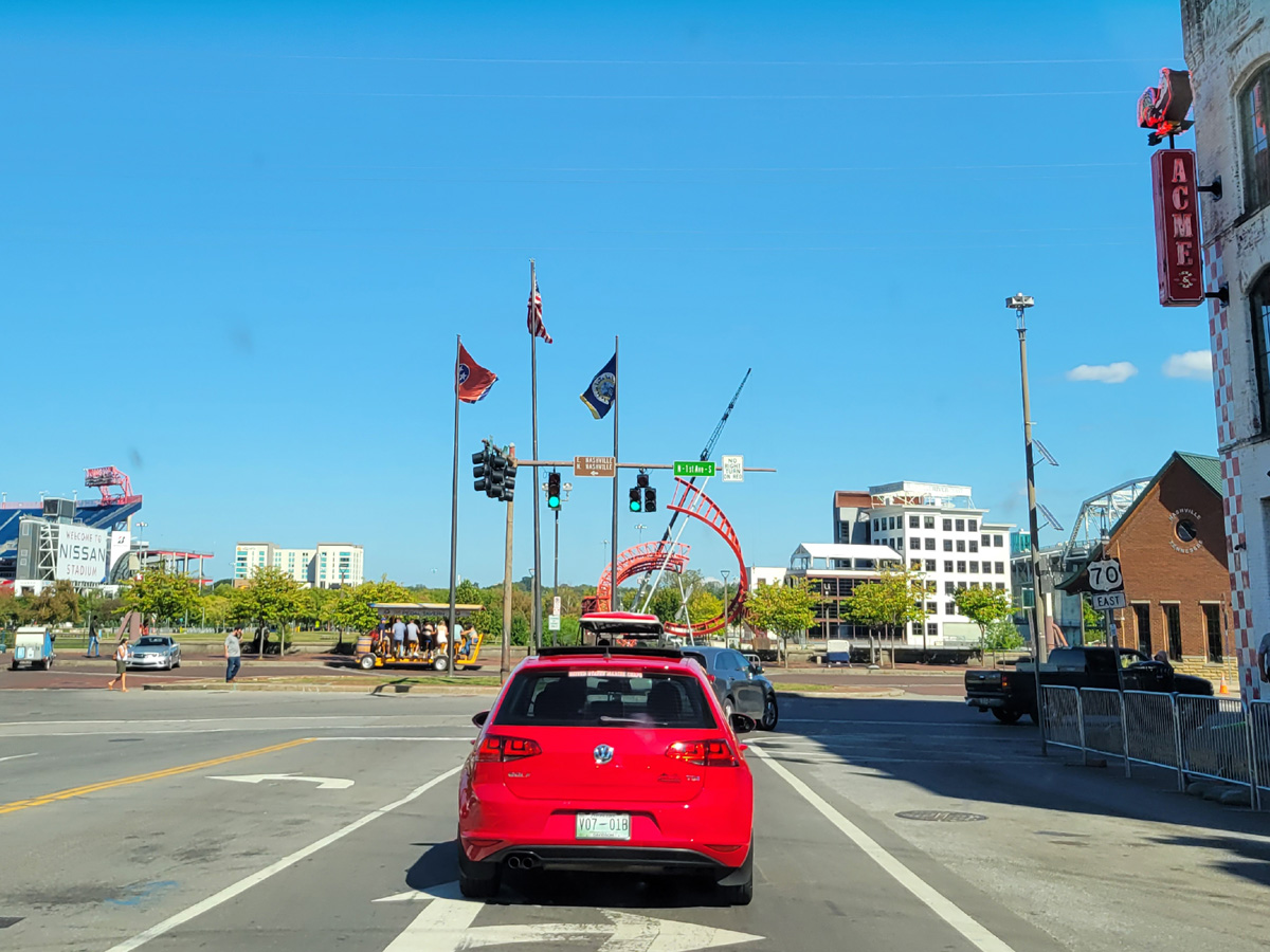 브로드웨이가 끝나는 곳에 높은음자리를 형상화한 듯한 조형물과 깃발들이 서있는 아래로, 오크통이 놓여진 노란 차에 사람들이 가득 앉아있는 것이 작게 보인다. 내슈빌의 명물이라는 페달태번(Pedal Tavern)으로 여러명이 함께 페달을 돌려서 시내를 돌아다니며 술을 마시는 '이동식 술집'이란다! 이제 우리는 여기서 남쪽으로 방향을 틀어서 불에 그을린 오크통에서 숙성하는 것으로 유명한 '테네시 위스키'의 고향을 찾아간다.