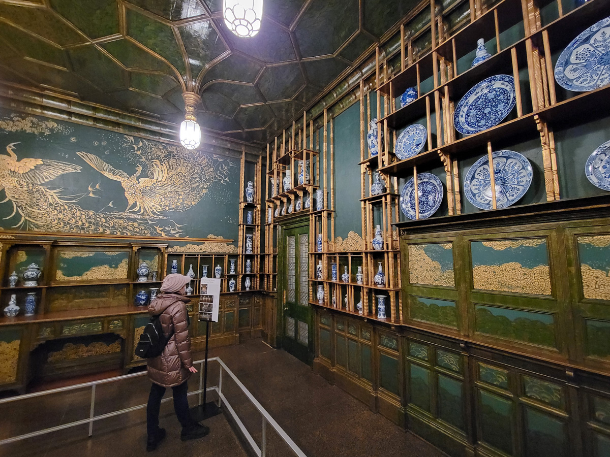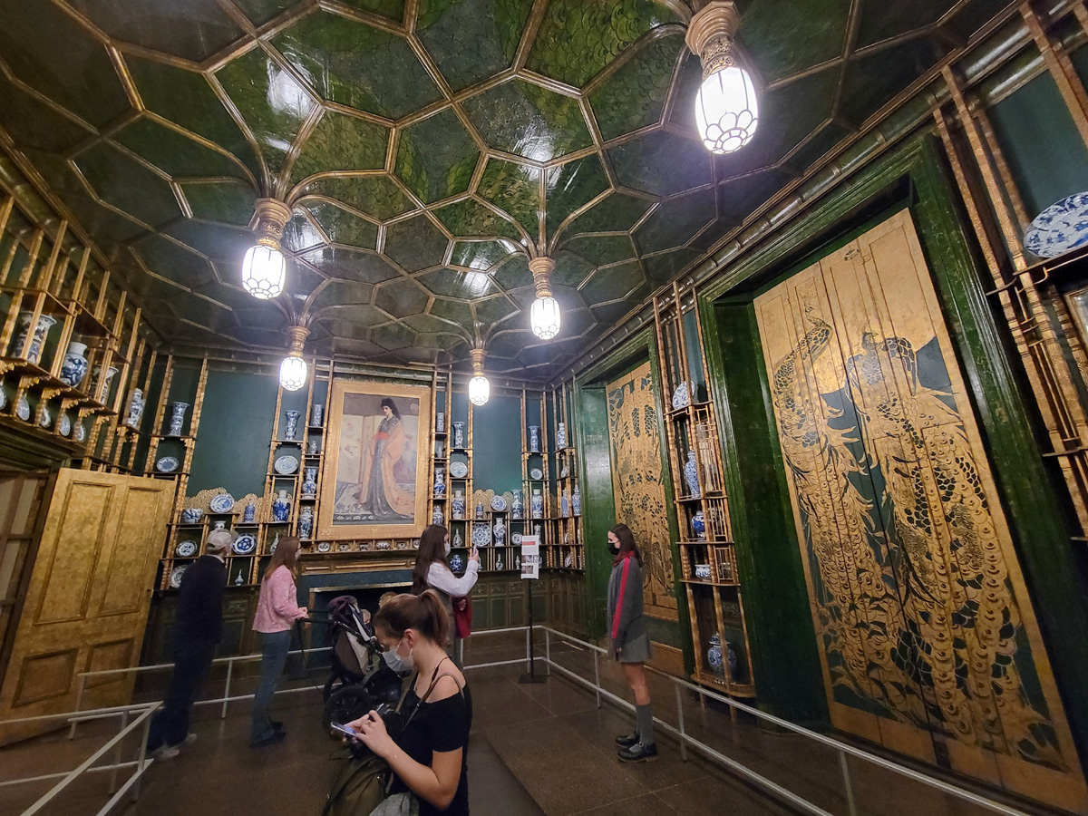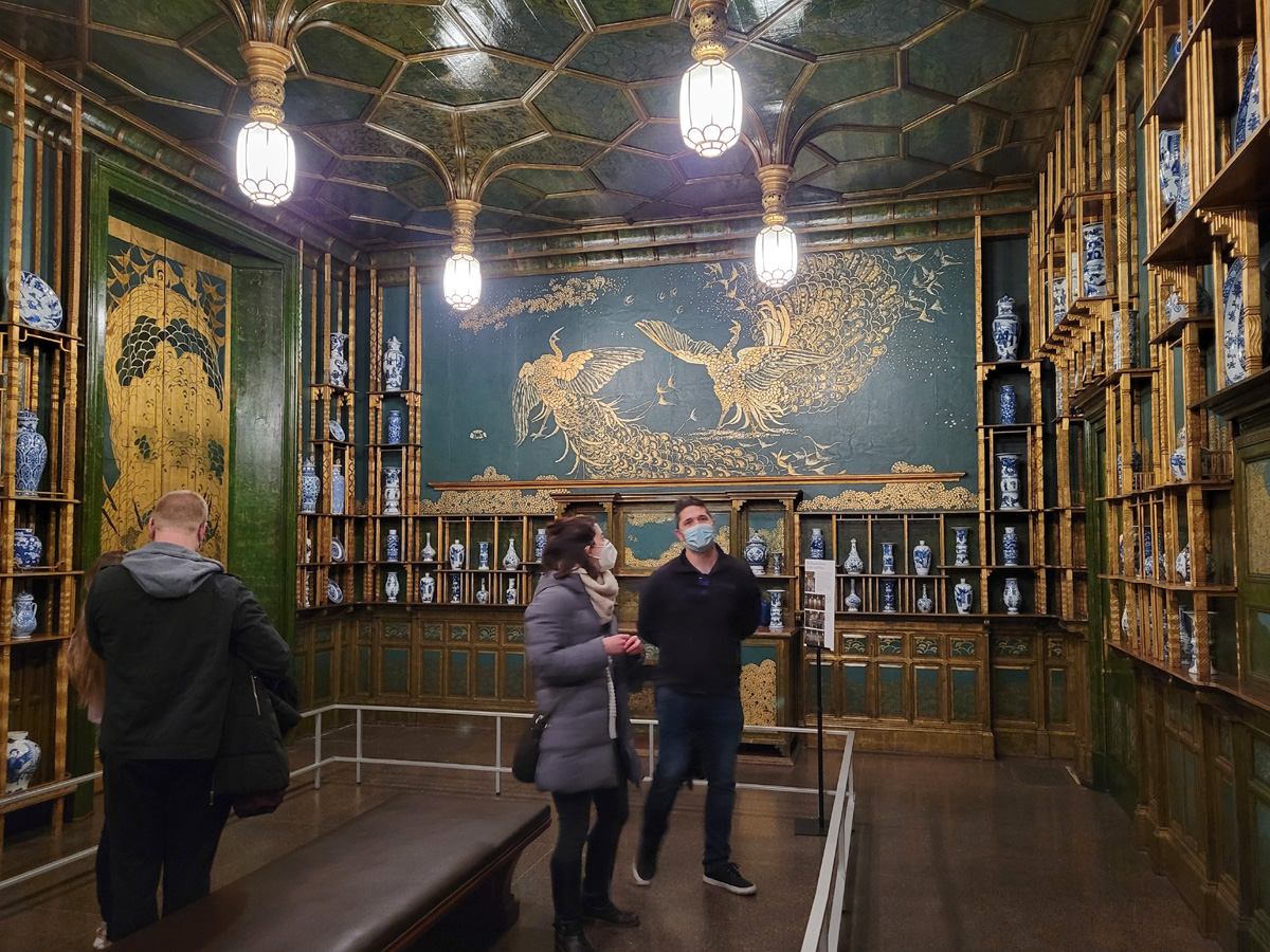 그 옆으로 12번 구석방에 이 갤러리에서 가장 유명한 전시인 원제 Harmony in Blue and Gold: The Peacock Room, 즉 '공작새의 방'이 나온다. 이 방은 원래 영국의 해운업자로 중국의 도자기를 수집했던 Frederick R. Leyland의 런던 저택의 거실로 1877년에 만들어졌는데, Leyland 사후 1904년에 프리어가 방을 통째로 사서는 미국 디트로이트에 있던 자신의 집으로 옮겼다가, 1919년에 그가 죽자 재단에서 지금 미술관으로 다시 옮겨온 것이다. 이 방을 꾸민 사람은 19세기 유명한 미국 화가인 제임스 맥닐 휘슬러(James McNeill Whistler)로 가운데 걸려있는 여인의 그림을 그린 사람인데,