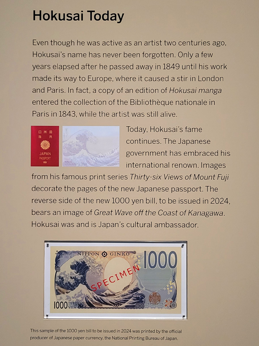 호쿠사이라는 화가의 이름이나 일본 목판화를 뜻하는 우키요에(Ukiyoe, 浮世絵)라는 말을 전혀 모르시는 분이라도, 위 사진 아래에 있는 2024년부터 유통될 예정의 일본 천엔권 지폐의 뒷면에 사용된 <가나가와의 거대한 파도> The Great Wave off Kanagawa 그림은 적어도 한 번은 보셨을거다. 위키피디아에 따르면 일본인의 그림으로는 고금을 막론하고 전세계에서 가장 유명하다고 할 수 있는데, 19세기 유럽 문화계에도 큰 파도를 일으켜서 고흐와 모네 등 인상주의 화가들에게 직접적인 영향은 물론이고, 작곡가 드뷔시가 이 그림을 보고 교향곡 <바다> La Mer를 작곡한 사실도 유명하다. 여기 프리어 미술관이 보유한 호쿠사이의 그림들은 내년에 다시 와서 직접 보기로 하고, 이제 마지막 전시실로 들어간다.
