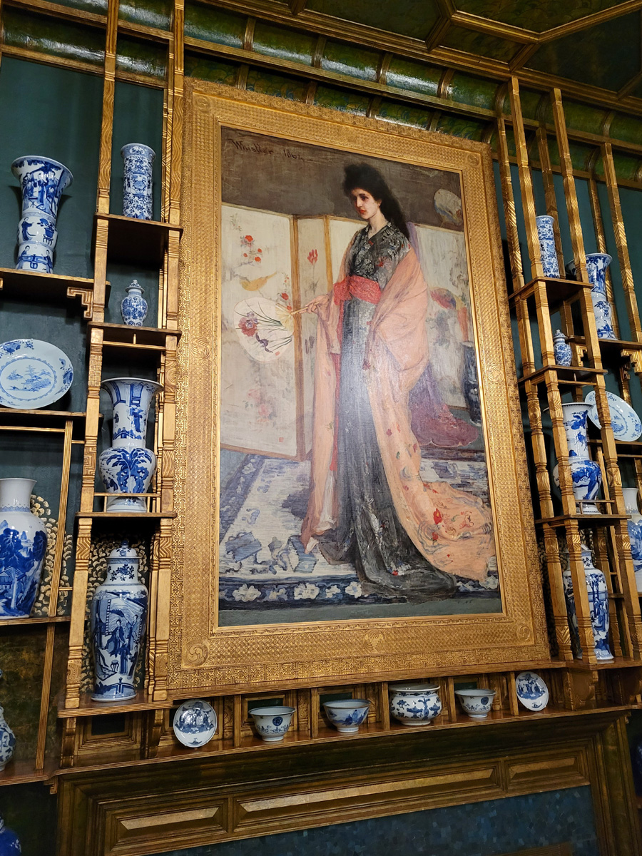 나가기 전에 입구쪽에 걸려있던 휘슬러가 그린 여인을 다시 바라본다. 그림의 제목이 The Princess from the Land of Porcelain <도자기의 나라에서 온 공주>인데, 좌우의 백자들은 중국산이지만 여인은 기모노를 입은 일본풍으로 그려져 있다. 한가지 더 피콕룸(Peacock Room)에 관한 정보를 알려드리면, 매달 세번째 목요일의 오후에는 공작이 그려져 있는 3개의 창문 가리개를 모두 열어서 자연광이 들어오는 상태에서 내부를 감상할 수 있도록 한단다.