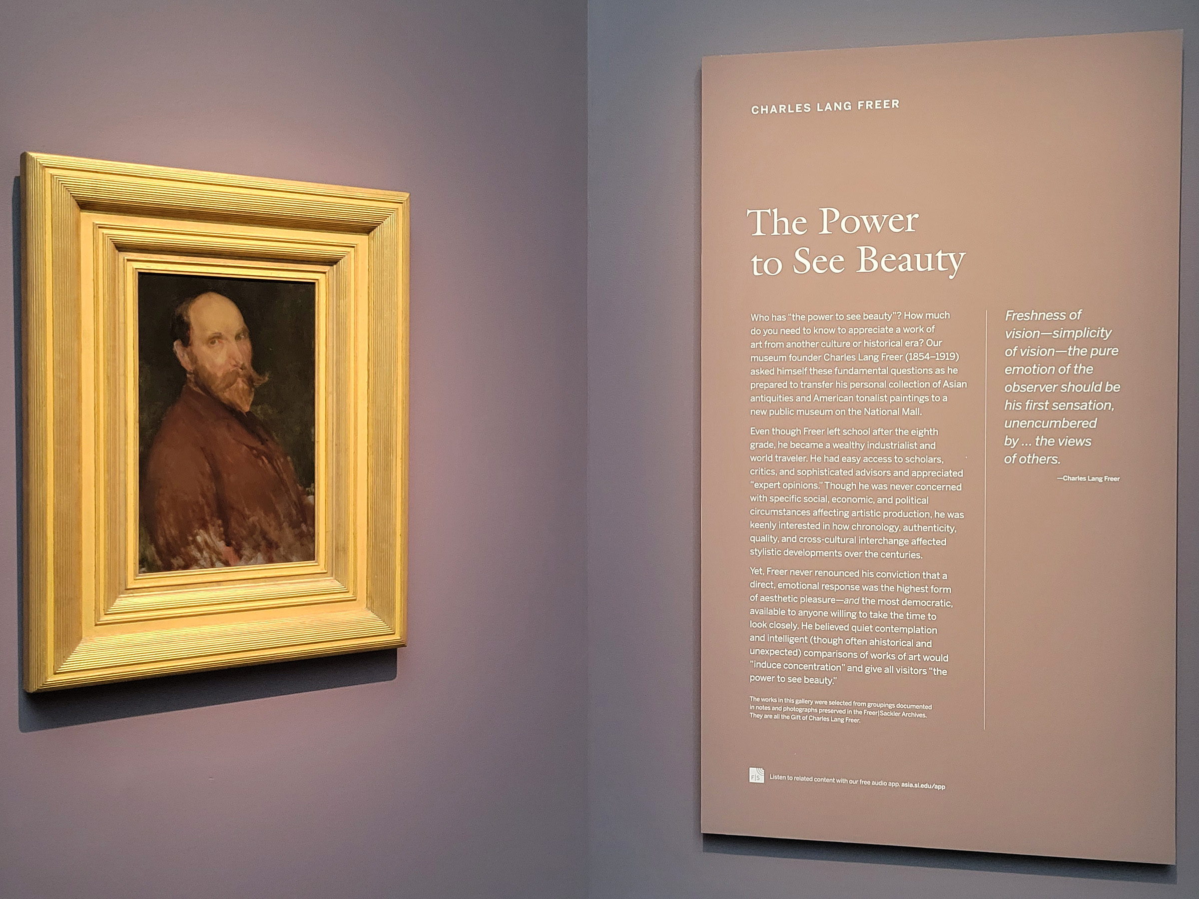 미국 스미소니언 박물관들의 비지터센터인 '캐슬(The Castle)'을 나와서 워싱턴DC 지역의 주민이 된 후에 처음으로 방문하는 새로운 미술관은, 약 백년 전에 오로지 찰스 랭 프리어(Charles Lang Freer) 한 사람의 기부와 수집품으로 세워졌던 곳인 프리어갤러리오브아트(Freer Gallery of Art)였다.