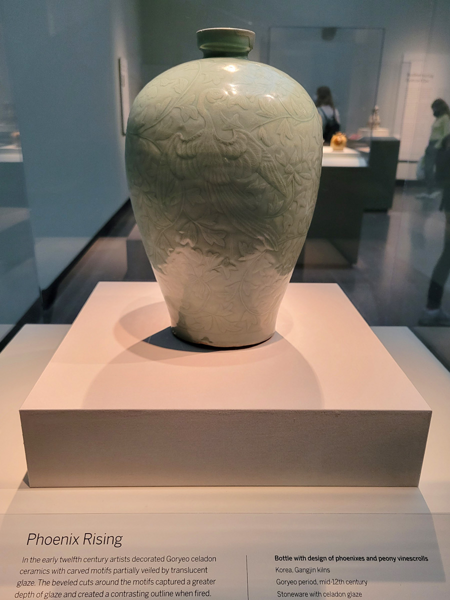 지금 벽면에 아슬아슬하게 빼곡히 전시된 청화백자들은 대부분 Leyland의 당시 수집품들인데, 혹시 큰 지진이라도 나면 다 떨어질 것 같아서, 바닥을 단단히 붙여놓았을 지도 모른다고 생각했다. 그런데, 놀라운 사실은 이 방과 도자기를 통째로 디트로이트로 옮겨갔던 Freer는 백자보다는 청자같이 색깔이 들어간 도자기를 좋아했기 때문에, 자신이 직접 수집한 청자들로만 다시 벽면을 채웠다고 한다. 그래서 지금 미술관에서는 주기적으로 Leyland의 백자와 Freer의 청자를 바꿔가면서 전시를 한다는 사실이다! 그래서 운이 나빠서 교체 시기에 방문하면 도자기들이 전혀 없는 경우도 있단다.