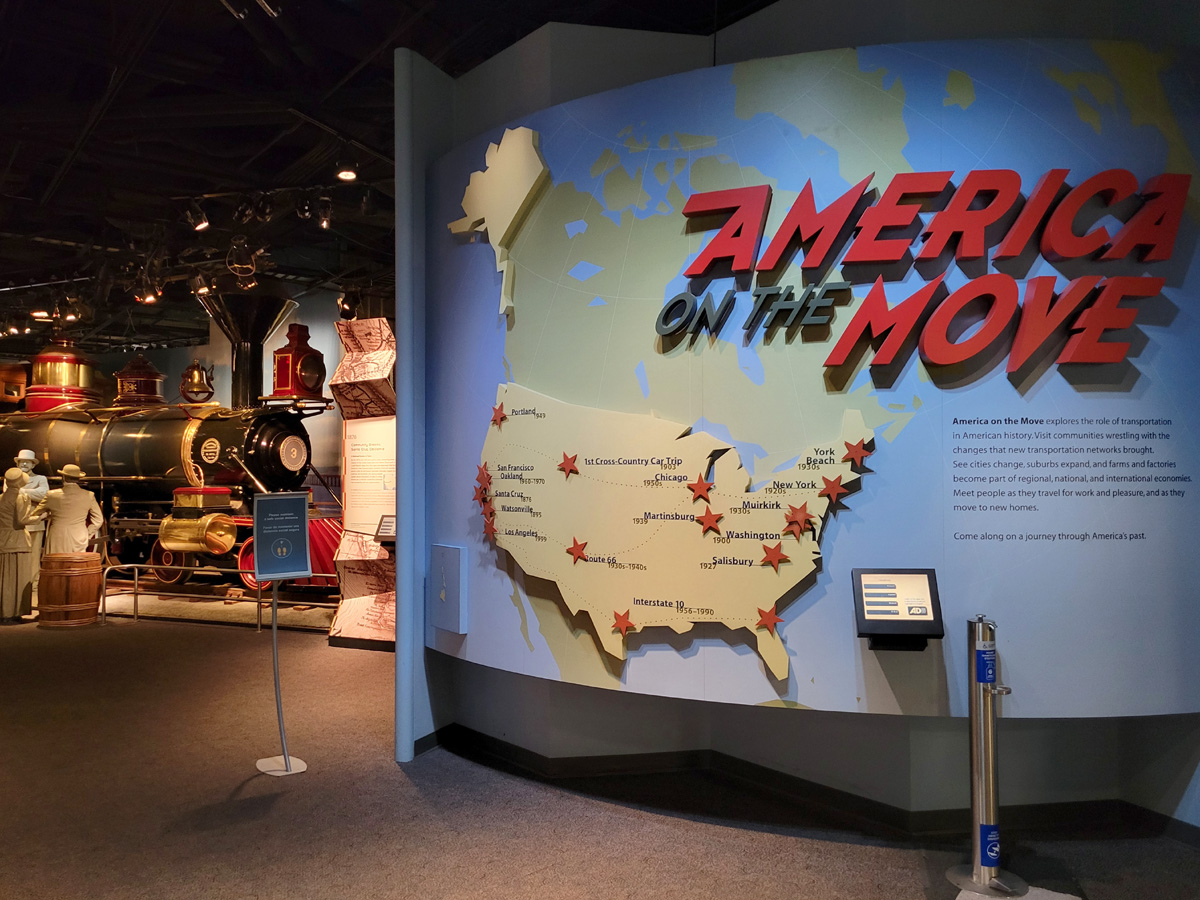 선박과 해상운송의 역사를 보여주는 On the Water: Stories from Maritime America를 지나서 육상교통의 역사를 소개한 America on the Move 전시실로 증기기관차 실물은 물론이고 작은 기차역까지 재현이 되어 있었다.