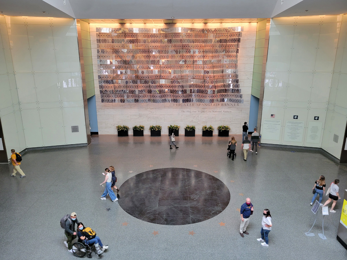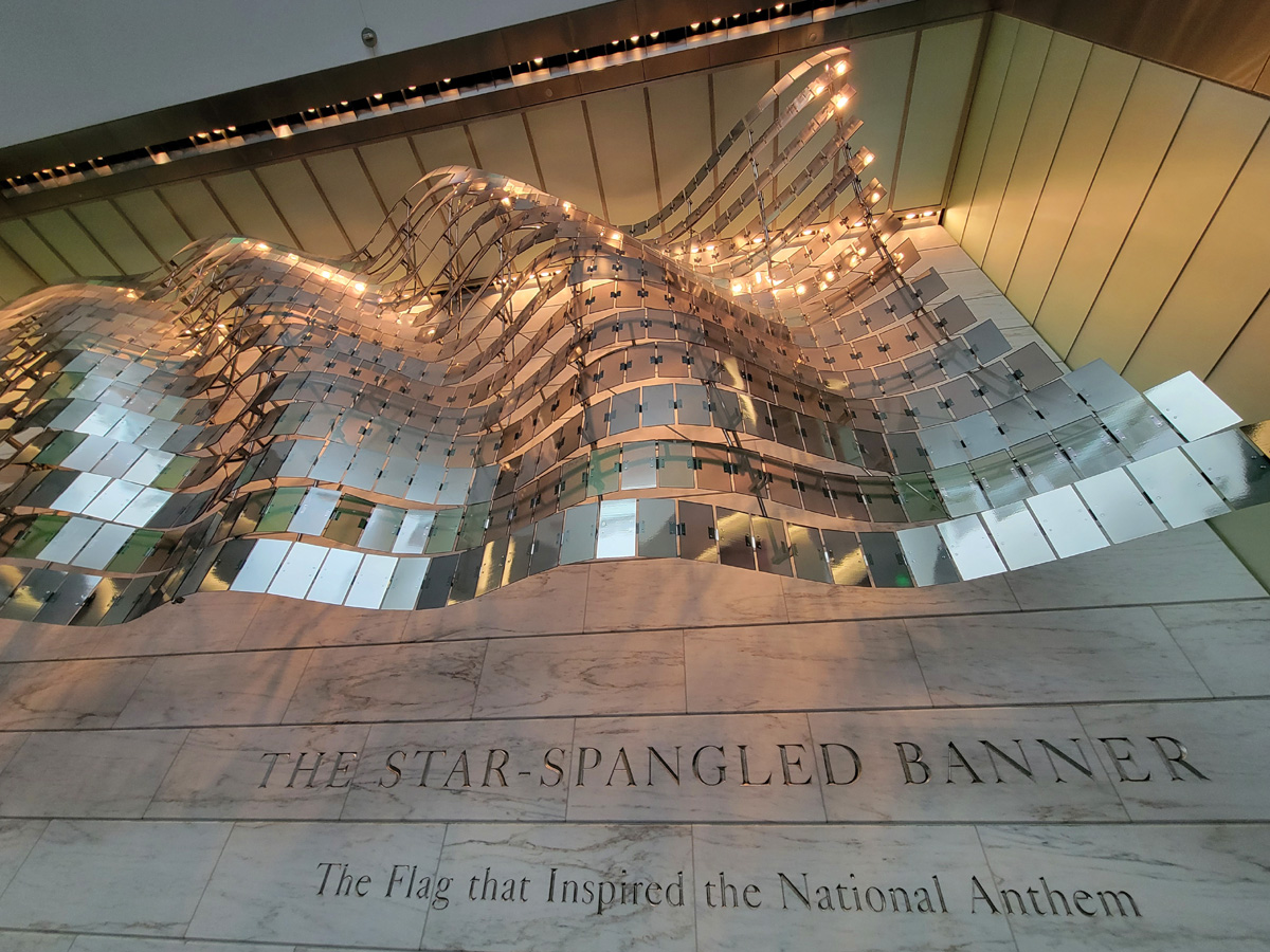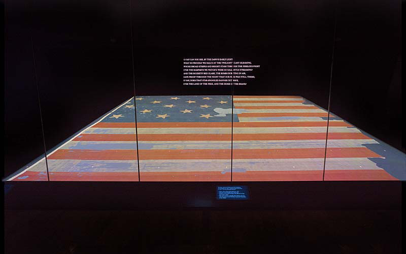 영미전쟁(1812~1815, 또는 1812년 전쟁) 중이던 1814년에 볼티모어 포트맥헨리(Fort McHenry)에서 펄럭이던 이 깃발을 보고, 프랜시스 스콧 키(Francis Scott Key)가 쓴 시가 소위 "성조기여 영원하라"로 불리는 미국의 국가이다. 가로 길이가 10미터가 넘는 예상보다 굉장히 큰 깃발이라서 놀랐는데, 지금은 보존처리가 되어서 암실 유리벽 안의 특수장치에 보관되어 있었다. 이 깃발의 이야기는 나중에 포트맥헨리를 직접 방문할 기회가 생기면 그 때 보다 상세히 설명하는 것으로 하고 여기서는 넘어간다.