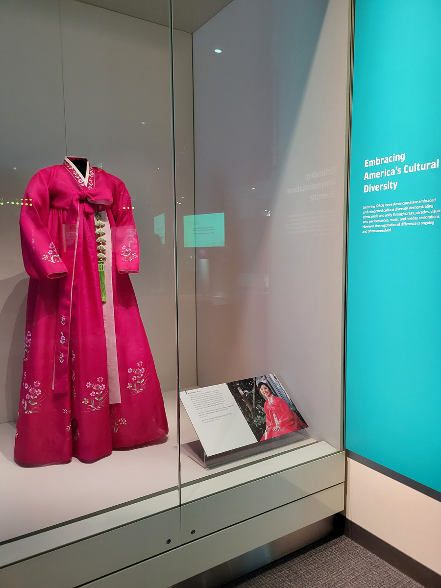 맞은편에 미국민의 다양성을 보여주는 Many Voices, One Nation 전시실에는 두 벌의 한복이 넓은 공간을 차지하고 전시되어 있다. 하나는 이민자로 미국인이 된 여성분이 2015년의 결혼식에서 입었던 이 빨간 한복이고, 다른 하나는 2004년에 미국으로 입양된 한국 아이가 입고있던 작은 어린이 한복으로 1950년대부터 한국에서만 20만명이 넘는 아동이 미국으로 입양되었다는 설명이 함께 있었다...