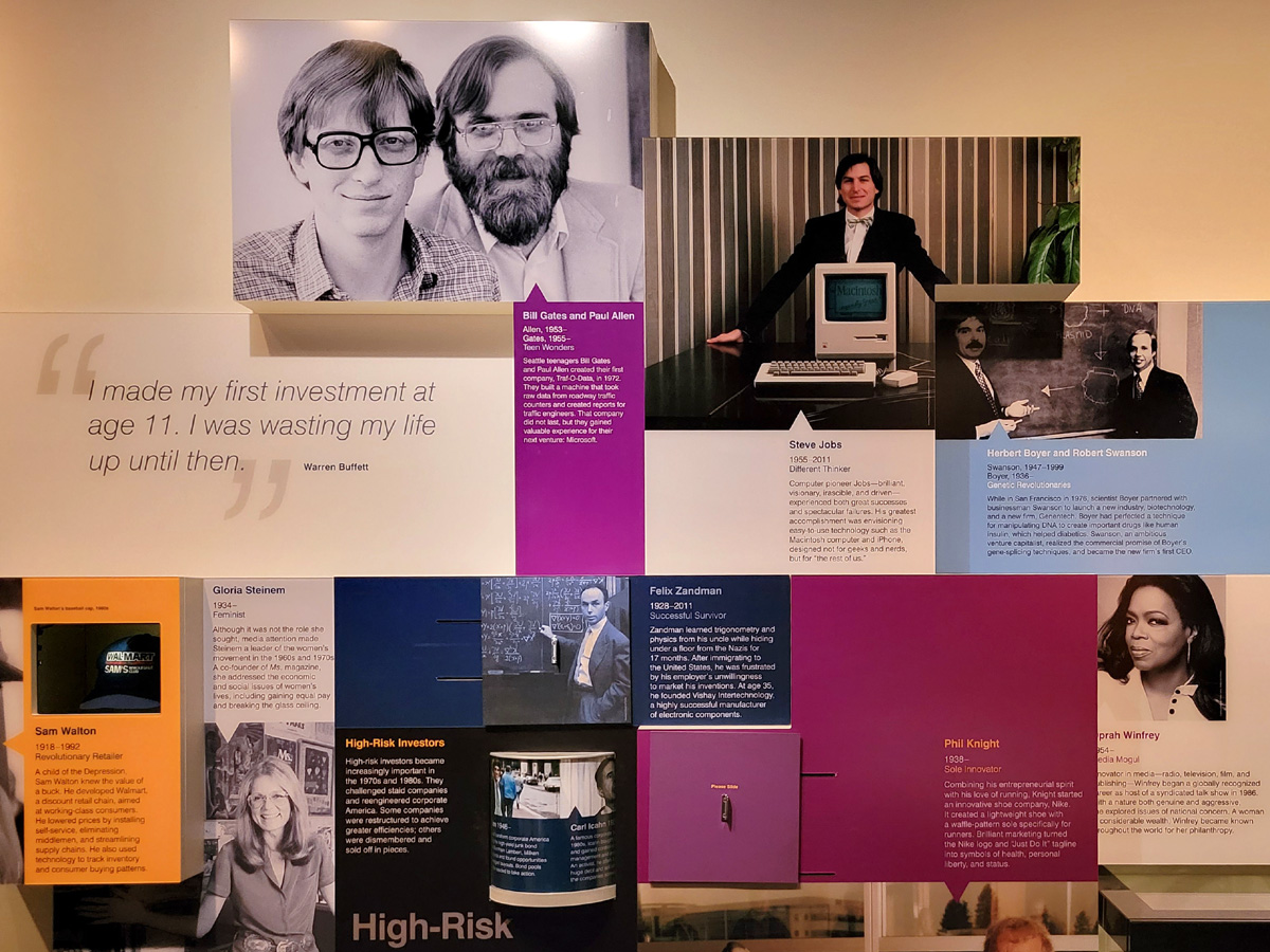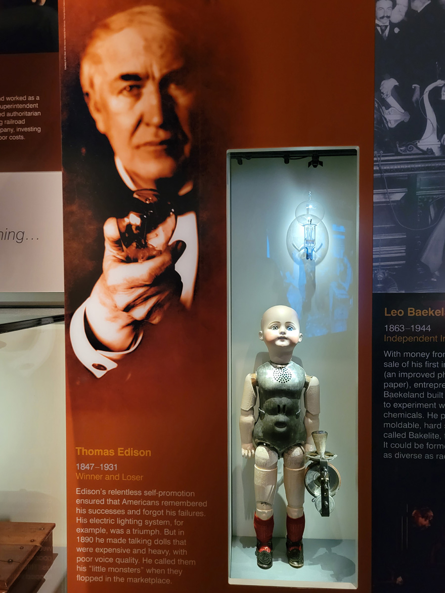 American Enterprise 전시실에는 미국의 산업과 경제 발달에 기여한 인물과 회사들이 소개되어 있는데, 발명가 토마스 에디슨(Thomas Edison)이 1879년에 만들었다는 전구(light bulb)는 예상을 했지만, 그가 1890년에 사진과 같은 '말하는 인형(talking doll)'을 만들었었다는 사실은 처음 알았는데, 설명에 따르면 유명한 발명가인 에디슨의 대표적인 실패작이라고 한다!