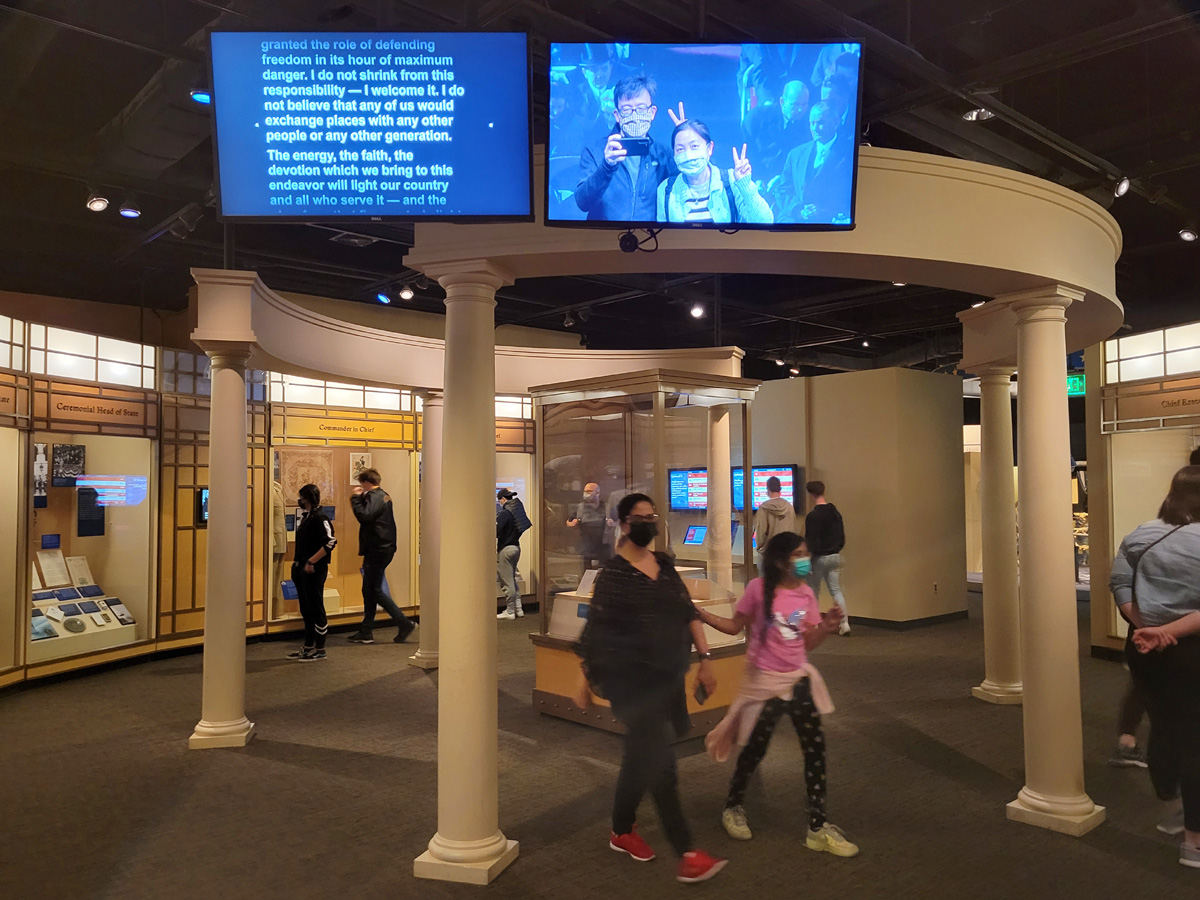 취임식 연단에서 V자를 하고 있는 우리 부부의 모습이 화면에 나오고 있다. 3층의 동쪽은 대통령과 함께 The Price of Freedom: Americans at War 제목의 전쟁사 전시가 중요하기 때문에, 두 전시실이 보수를 마치고 새로 개장을 했다고 하면 다시 방문할 생각을 하고 있다.