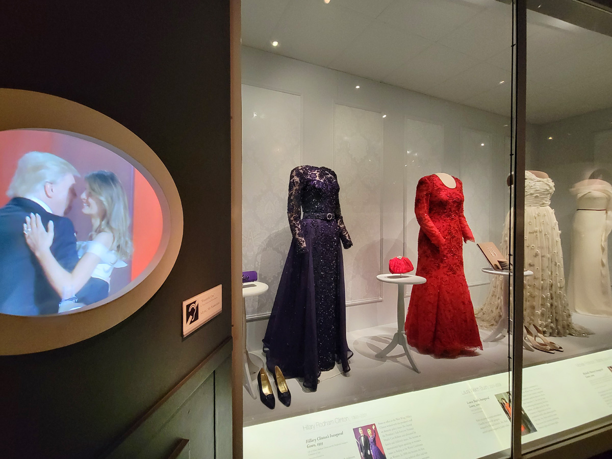 가장 최근의 8명의 영부인들이 취임식 저녁의 연회에서 입었던 드레스가 그 옷을 입고 춤을 추는 영상과 함께 전시가 되어 있는데, 왼쪽 화면에 트럼프와 춤을 추는 멜라니아가 입고 있던 그 드레스가 제일 오른쪽 끝에 보인다.