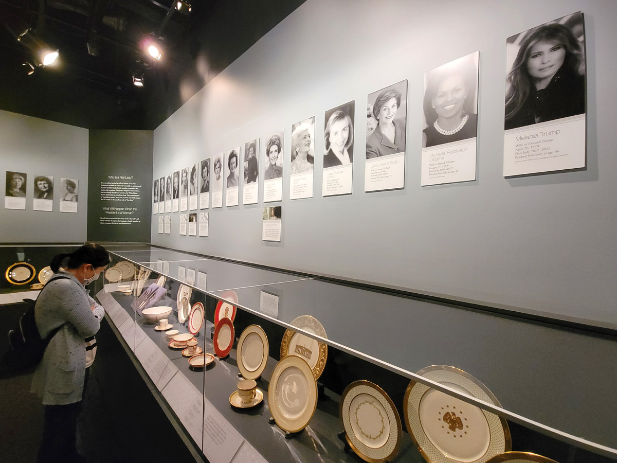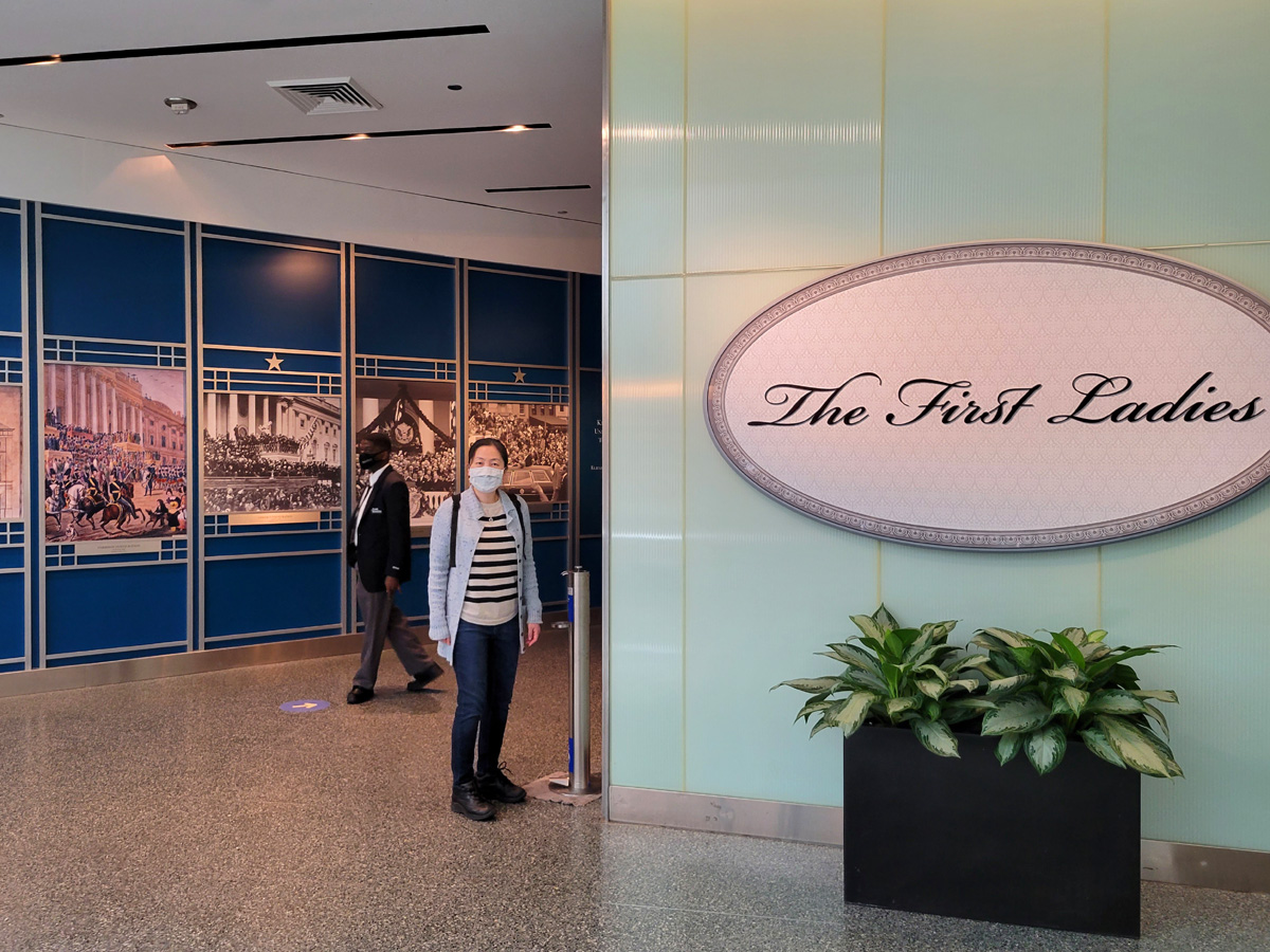 재클린 케네디 등이 입었던 드레스들이 먼저 나오고, 다음으로 초대 영부인부터 제일 오른편 멜라니아까지 흑백사진과 함께, 그녀들이 직접 선택한 백악관에서 사용된 그릇들이 전시가 되어 있다.