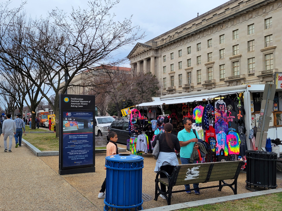 이렇게 2시간여의 국립 미국사박물관(National Museum of American History) 구경을 마치고 1층 북쪽 출구로 밖으로 나왔다. 미국사박물관 앞의 도로는 일반차량의 주차는 불가하고 아마도 푸드트럭과 기념품 판매대의 전용공간으로 생각이 된다. 원래는 바로 옆의 다른 박물관 한 곳을 연달아 더 둘러볼 계획이었으나, 역사공부를 더 했다가는 다리는 물론 머리에도 쥐가 날 것 같아서 그만 집으로 돌아갔다.