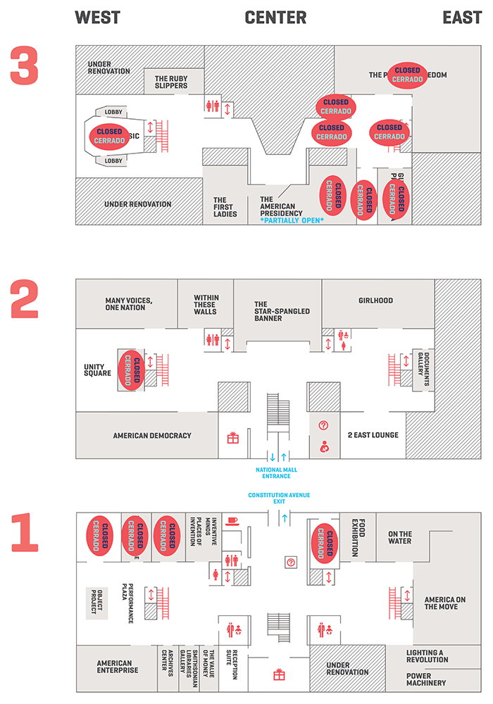 지하를 제외하고 3개 층의 전시장을 보여주는 지도인데, 내셔널몰의 정문은 바로 2층으로 연결된다. 빗금으로 칠해진 부분과 빨간딱지가 붙은 곳은 모두 보수중이거나 준비중으로 거의 절반 가까운 곳을 보지 못했음에도 불구하고, 처음에는 각 층별로 한 편의 포스팅으로 써야겠다고 생각할 만큼 구경거리가 많았다. 하지만 2차 대륙횡단과 지난 주에 다녀온 봄방학 여행 등등 다른 밀린 일거리(?)들도 많으므로... 각 전시실을 소개하는 정도로만 최대한 축약해서 한 편으로 간단하게 정리를 해보기로 했다. (전시장 제목의 링크를 클릭하시면 해당 웹사이트로 연결됨)