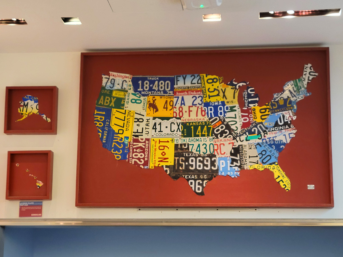 그리고 미국 각주의 옛날 번호판을 이어붙여서 만든 미국지도도 판매하고 있었는데, 왼편 아래에 작게 씌여진 정가는 3,900달러이다. 네바다와 캘리포니아 번호판 2개는 있으니까, 나머지 주들의 번호판을 이베이에서 사서 하나 직접 만들어볼까 고민중이다~