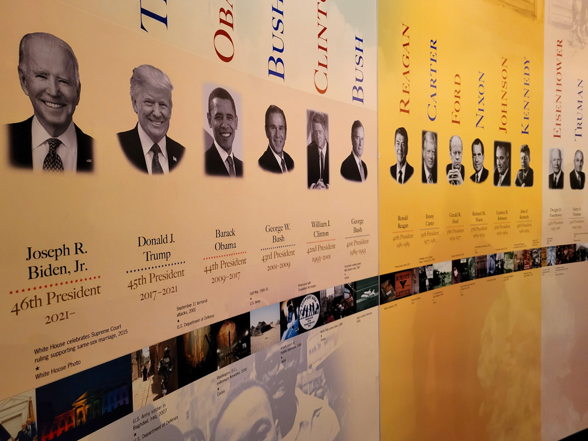 원형의 벽면에는 역대 대통령들의 사진과 이름이 차례로 모두 붙어있는데, 바이든 왼쪽에 있던 빈 공간에는 앞으로 누구 사진이 붙을지? 오른편으로는 차례로 트럼프, 오바마, 부시, 클린턴, 또 부시, 레이건 등등... 얼마 전에 한국의 대통령 선거가 있어서 그런지, 이렇게 역대 대통령들을 차례로 쭉 붙여놓은 것을 보는 느낌이 남달랐다. "체내의 바이러스를 죽이기 위해 표백제를 주사하자고 했던 저 트럼프도 대통령 했었는데 뭐..."