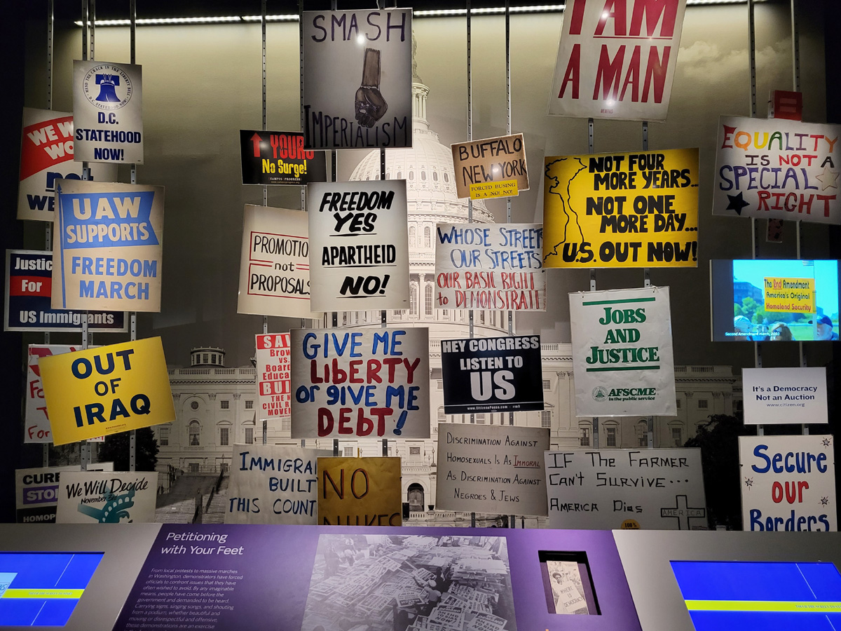 국회의사당을 배경으로 여러 시위에 사용된 피켓들이 보이는데, 실제로 현장에서 사용되었던 물품을 수거한 것이다. 스미소니언 재단은 작년 1월 6일의 '의사당 습격' 직후에도 당시 사용된 피켓과 깃발 등도 미국역사의 한 부분으로 최대한 수집을 했다고 하는데, 앞으로 시간이 흘러서 어떤 식으로 이 박물관에서 전시가 될 지 궁금하다.