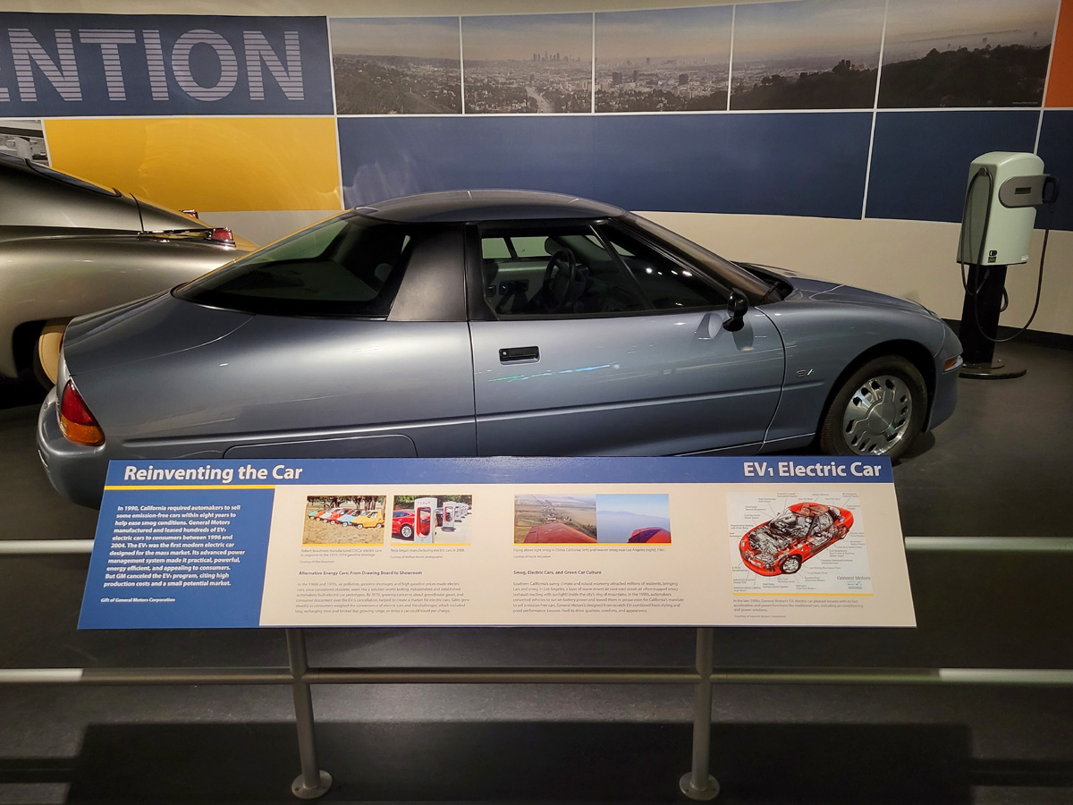 사진 속의 자동차는 GM에서 1996년에서 2004년까지 만들었던 최초의 상용 전기차인 EV1이라고 한다. 앞서 산업 전시실에서도 테슬라 이야기가 없어서 아직은 역사박물관에 등장하기에는 너무 이른가 생각했는데, 여기 안내판에 테슬라 슈퍼차지 충전소 사진이 있는 것으로 봐서 그건 아닌 것 같다.