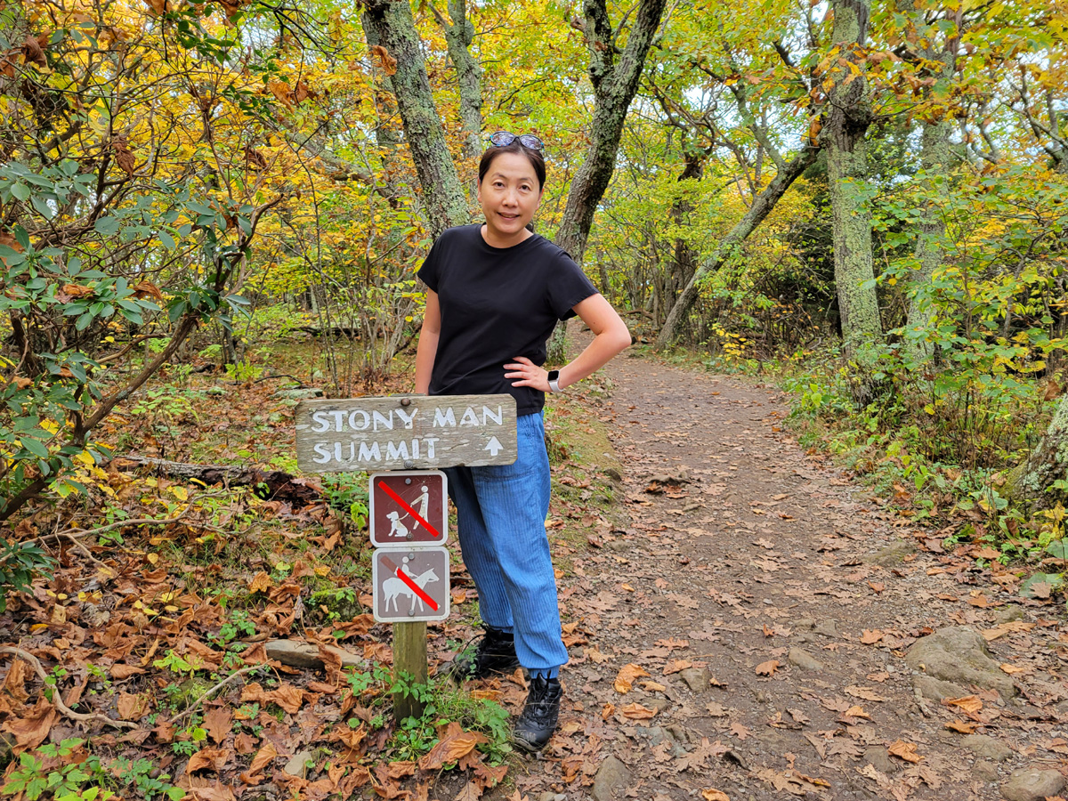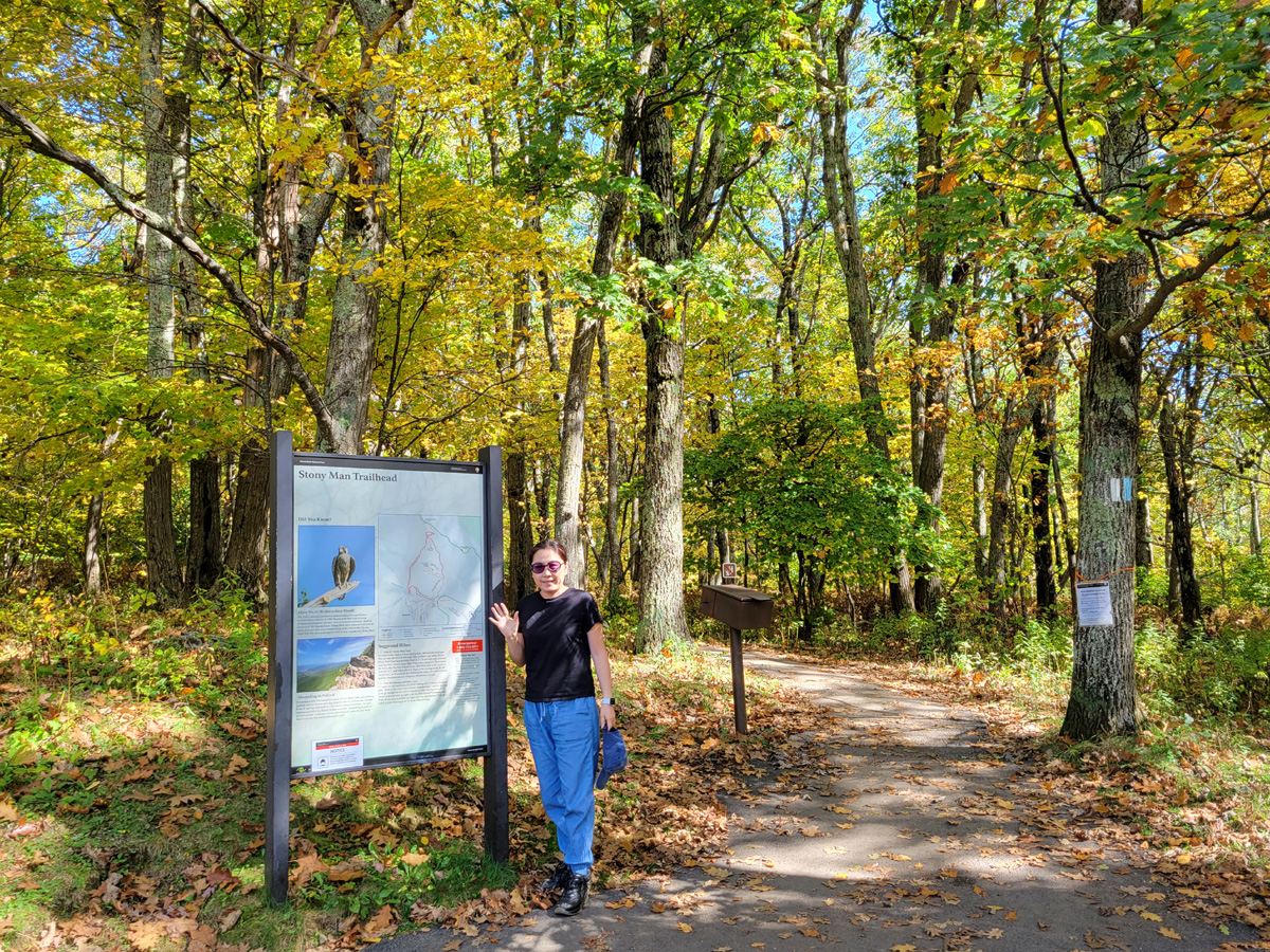 스토니맨(Stony Man) 트레일이 시작되는 곳의 안내판 옆에서 아내가 손을 흔들고 있다. (구글맵으로 위치를 보시려면 클릭) 오솔길 건너편 큰 나무에 흰색과 파란색의 페인트가 세로로 길쭉한 직사각형으로 칠해져 있는 것이 보이는데, 바로 이 길이 국립공원청이 관리하는 423개의 Official Units에 독립적으로 포함되는 애팔래치안 국립경관로(Appalachian National Scenic Trail)임을 알려주고 있다.