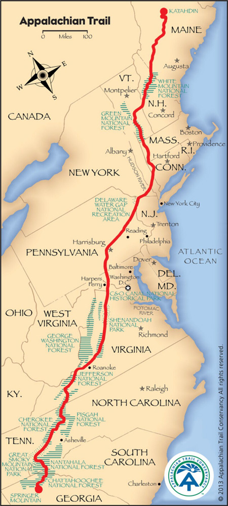 애팔래치안 트레일(Appalachian Trail, AT)은 지도와 같이 남쪽 조지아(Georgia) 주의 Springer Mountain에서 출발해, 미동부의 14개 주를 거쳐서 북쪽 메인(Maine) 주의 Mount Katahdin에서 끝나는 총길이 약 2,180마일(3,500 km)의 등산로로 1937년에 완성되었다. 흔히 미서부를 남북으로 종주하는 PCT(Pacific Crest Trail), 대륙경계를 따라가는 CDT(Continental Divide Trail)와 함께 묶어서 '하이킹의 3관왕(Triple Crown of Hiking)'으로 불린다.